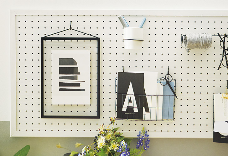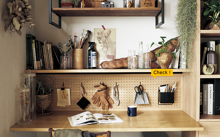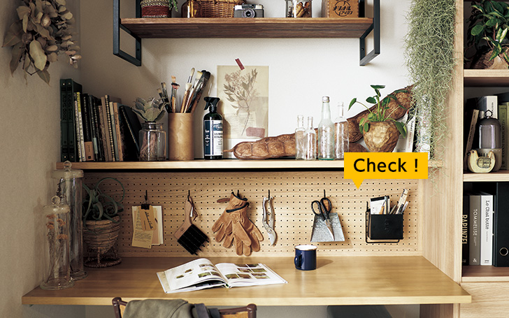 壁面収納に有孔ボードを取り入れれば、よく使うものをワンアクションで手に取れて便利です。ギャラリースペースとしても活用できるので、お気に入りの収納グッズや趣味の雑貨をふんだんに取り入れて、自分らしさあふれるインテリアがつくれます。