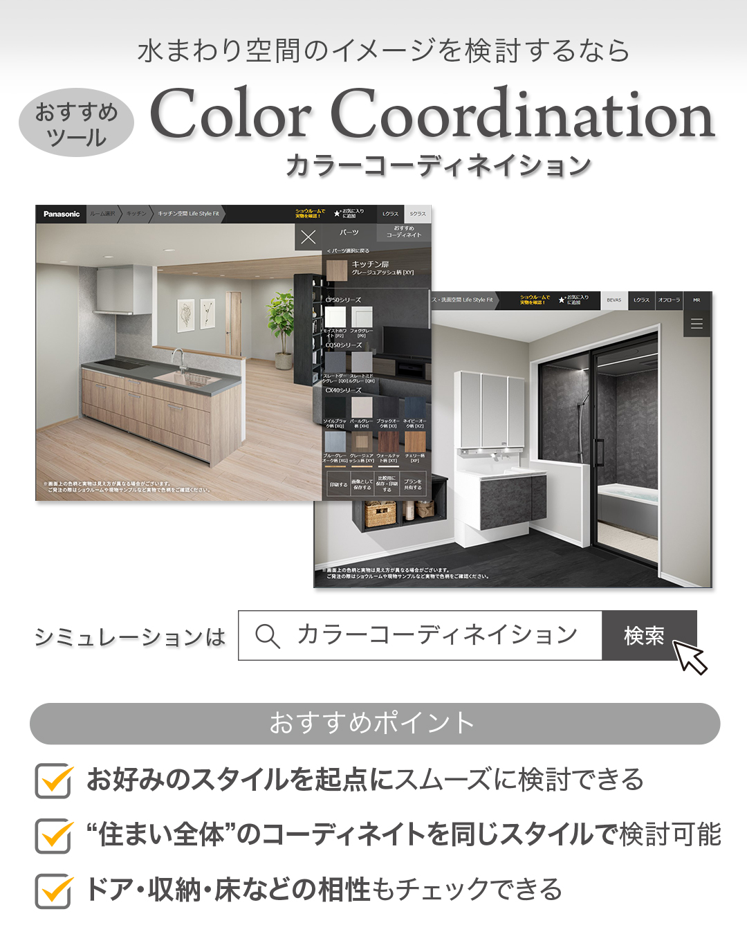 イメージ検討の際におすすめなのが、パナソニックの「#カラーコーディネイション 」。WEBサイト上で、キッチンや洗面空間のシミュレーションが簡単に、手軽に実施できます。