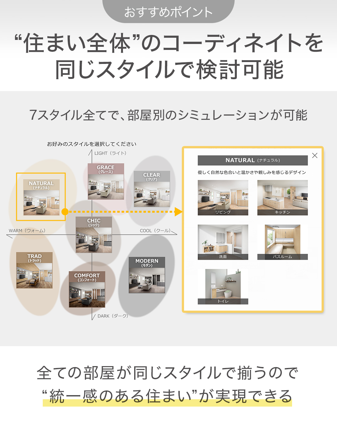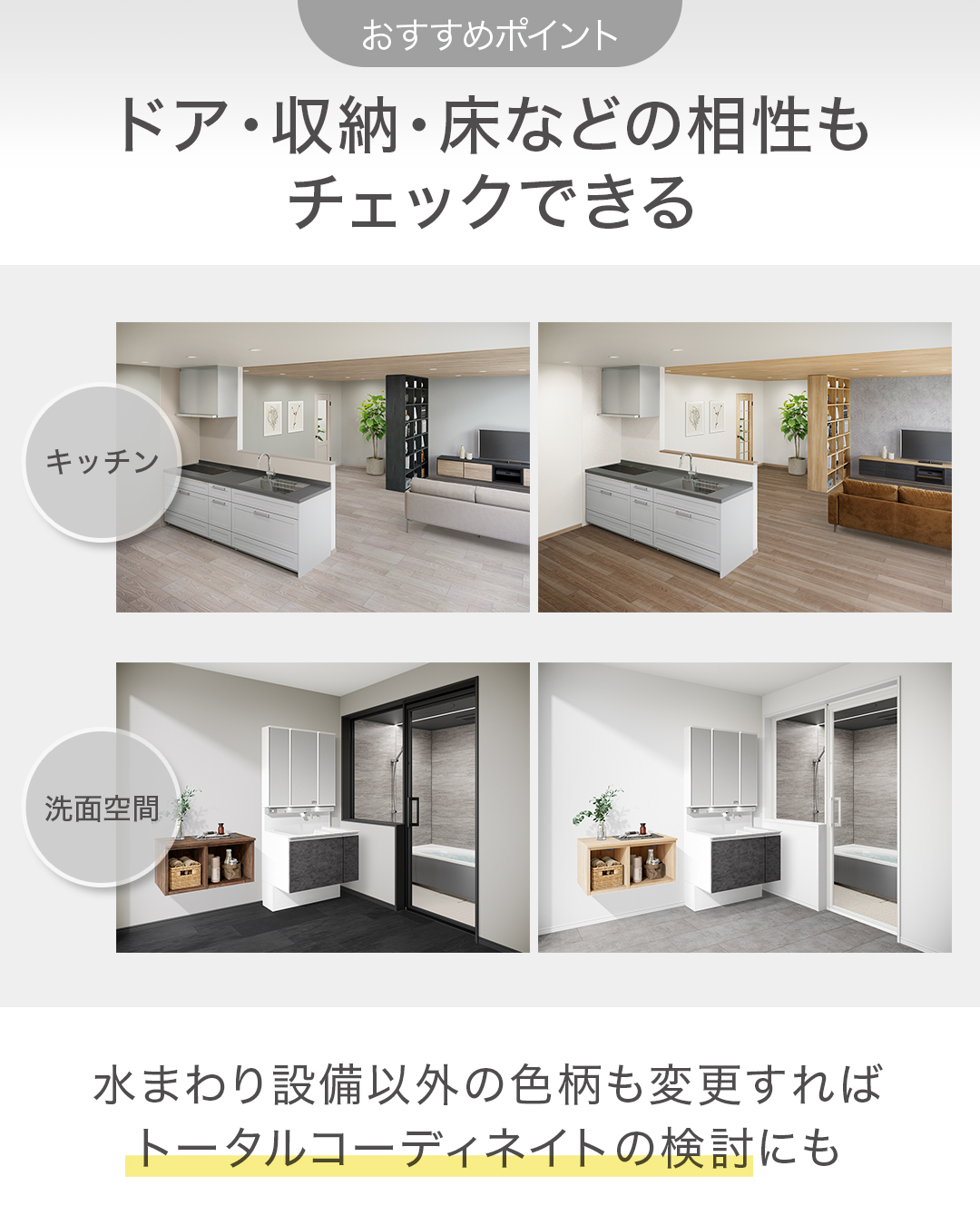 また、住まい全体の統一感や、ドア・収納・床材などとの相性もしっかり考慮できるのであなたの理想の住まいにぴったりの水まわり空間が検討できます。
