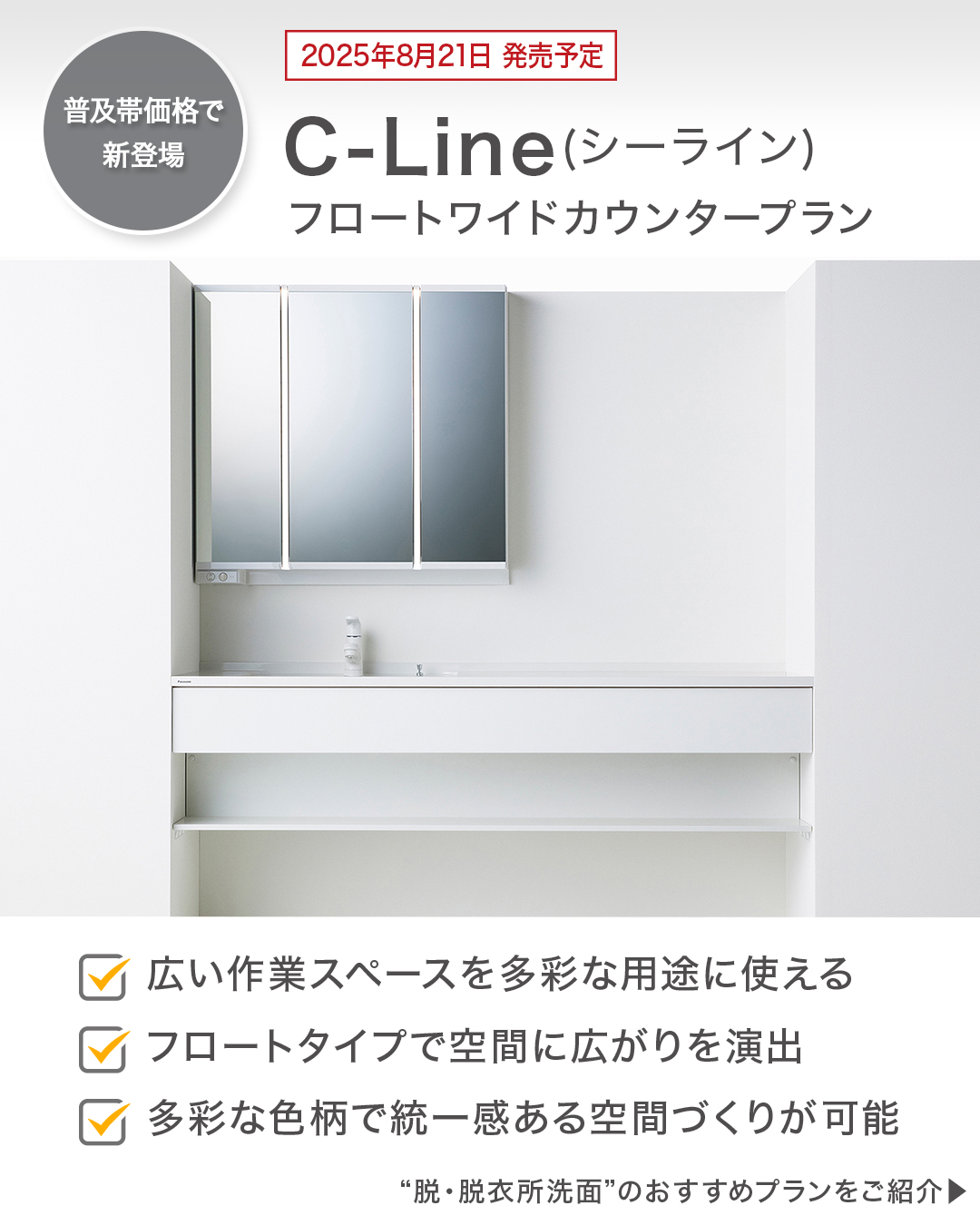 また、「脱・脱衣所」洗面の設置をお考えなら、2025年8月発売予定のパナソニックの洗面ドレッシング「#シーライン 」フロートワイドカウンタータイプがおすすめ。最大1700mmの広々とした作業スペースを確保できるので、設置場所に合わせた様々な用途に使える他、フロート設置することで限りあるスペースでも圧迫感を減らしながら設置できます。
