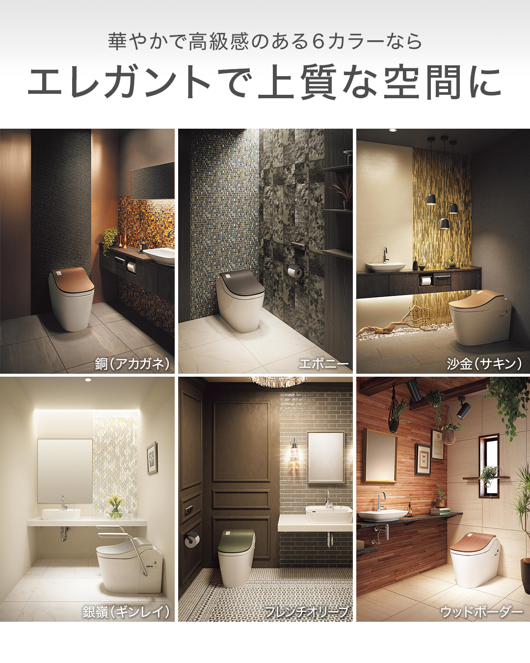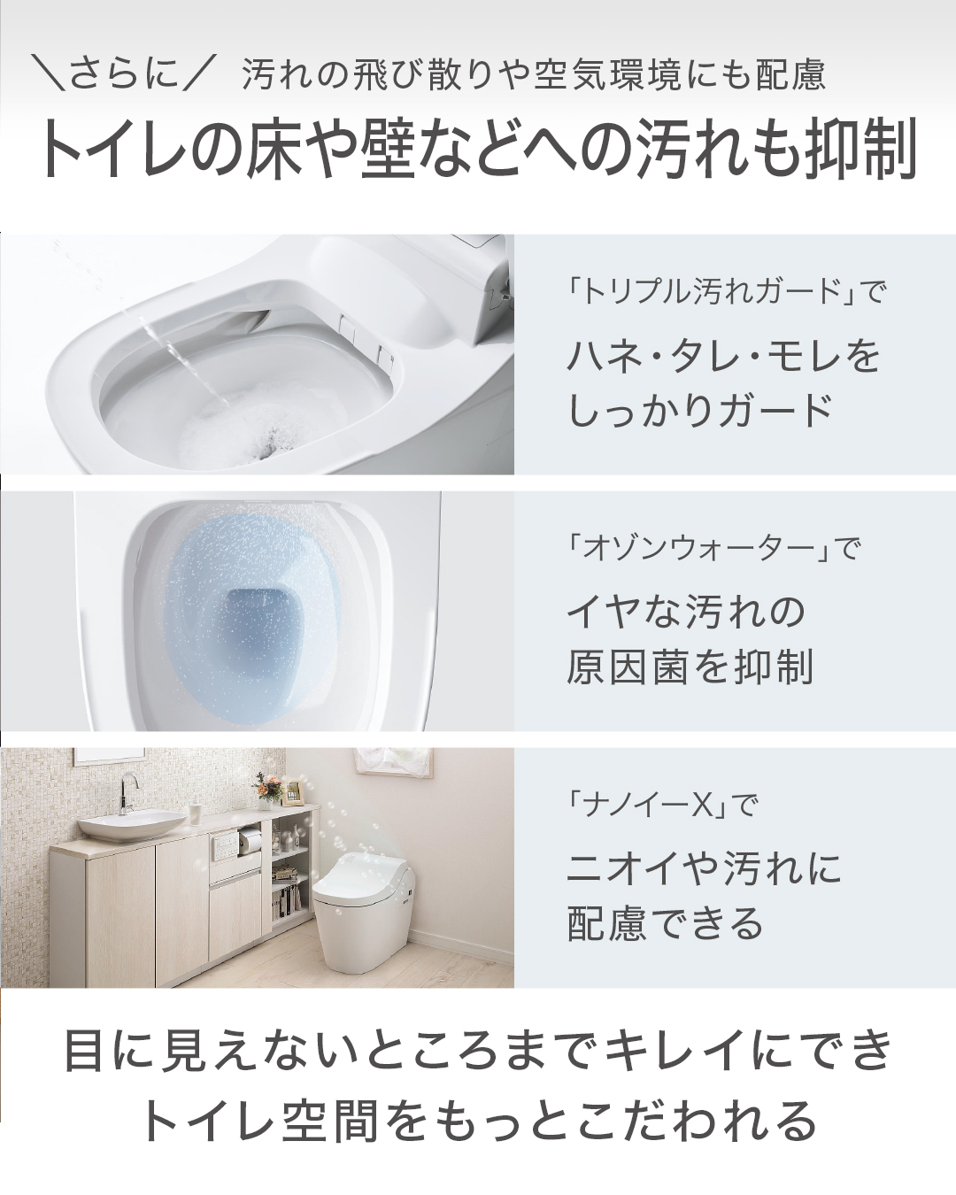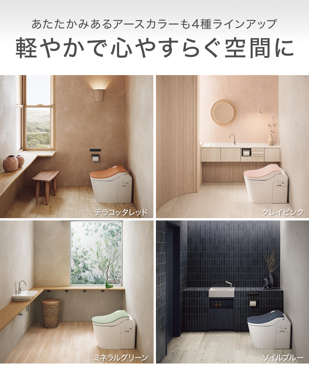 全10柄の豊富なカラー便フタが多彩なインテリアテイストにマッチするうえ、タンクレスなのでスッキリとした空間に仕上がります。ハネ・タレ・モレを抑える「#トリプル汚れガード 」、除菌効果のある「#オゾンウォーター 」や、ニオイや汚れを抑制する「#ナノイーX 」など、見えない部分にも配慮できるのでワンランク上の心地よさを実現可能。