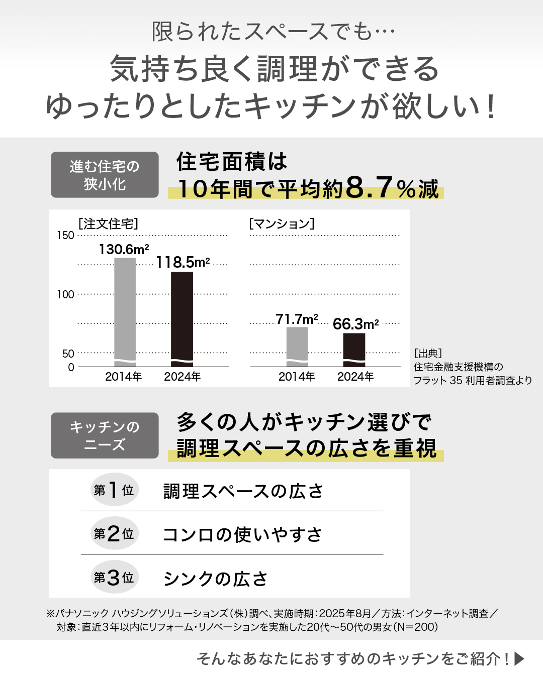 住宅価格や資材の高騰などから、住まいのスペースやリフォームの内容はどうしても限られてしまいがちな昨今。しかし、パナソニック ハウジングソリューションズ(株)が実施したアンケートによると、キッチンにおいて多くの人が「調理スペースの広さ」を重視しているという結果に。せっかくリフォームするなら、キッチンの快適さもしっかりアップさせたいですよね。