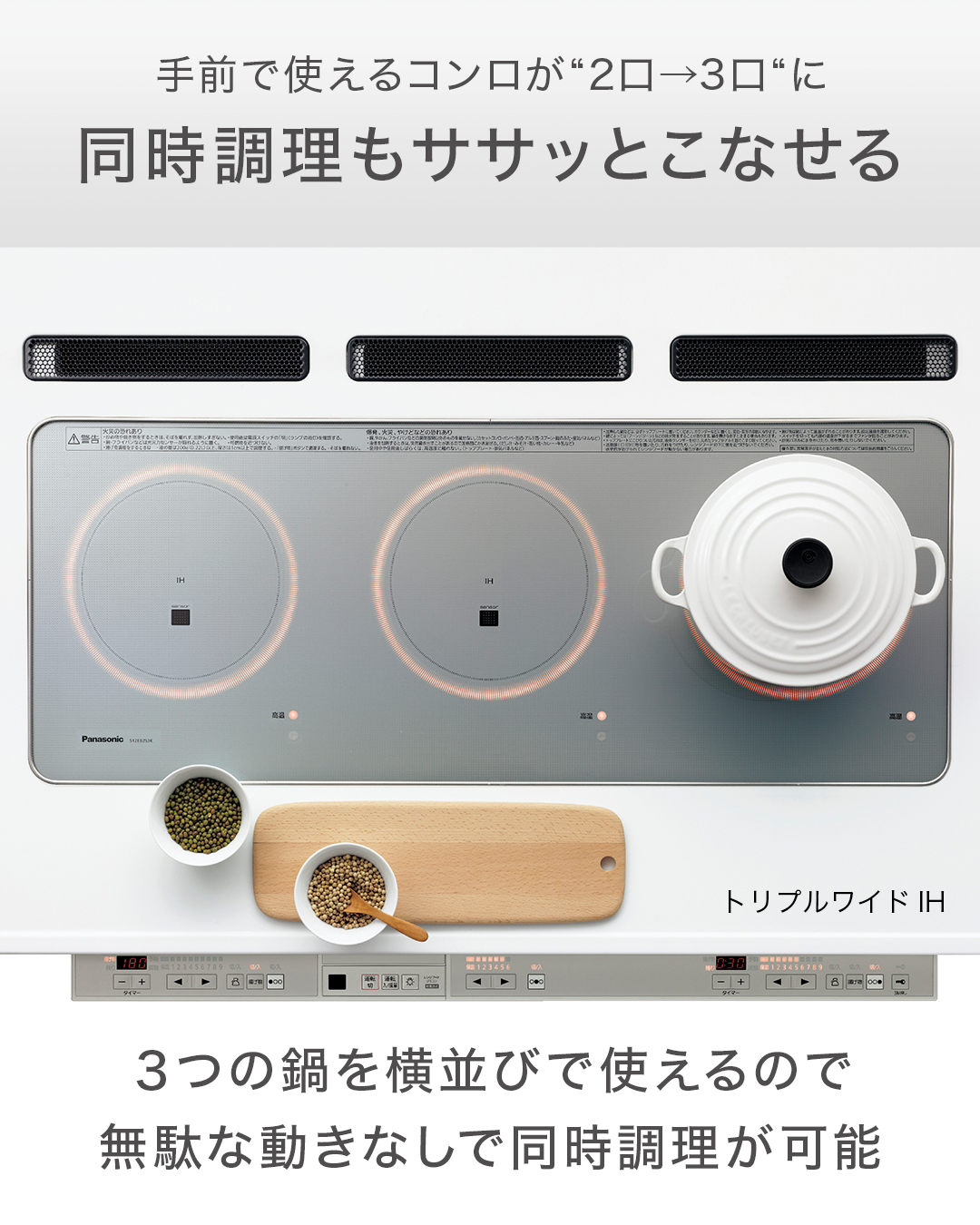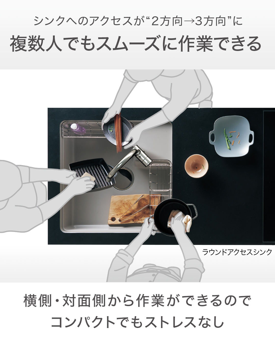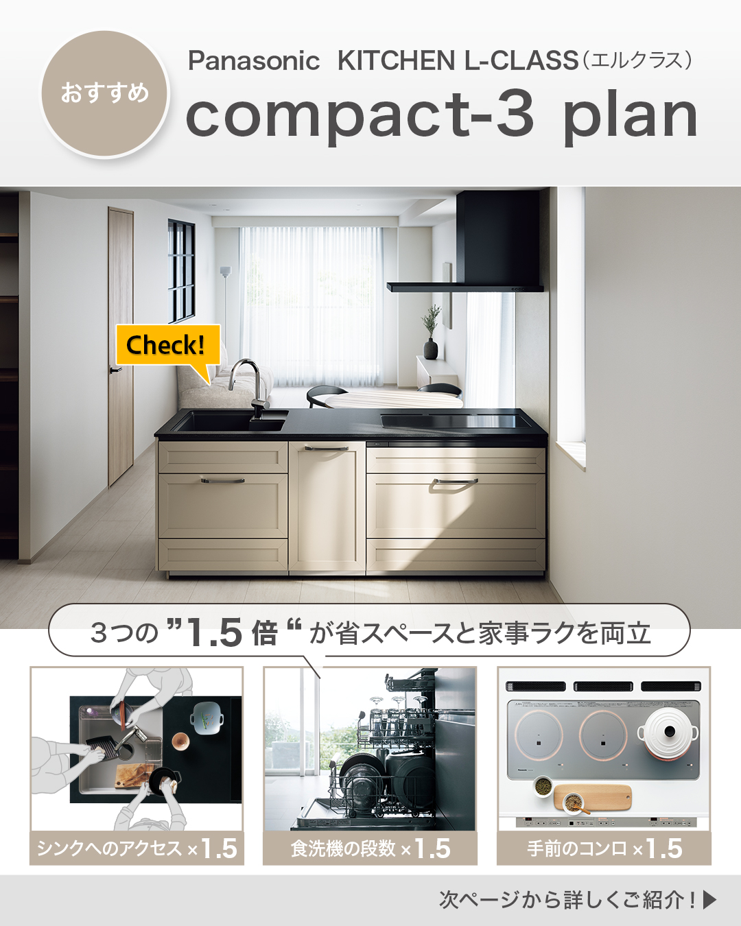 そんな方におすすめなのが、「#パナソニックキッチン」の新プラン「compact-3 plan」。省スペースでも設置がしやすい上、3方向からシンクが使える「#ラウンドアクセスシンク 」、大容量の3段式で調理器具などもまとめて洗える「#フロントオープン食洗機 」、3つの鍋を横並びで使えて同時調理がしやすい「#フラットワイドコンロ 」など、高機能の設備を多数搭載。