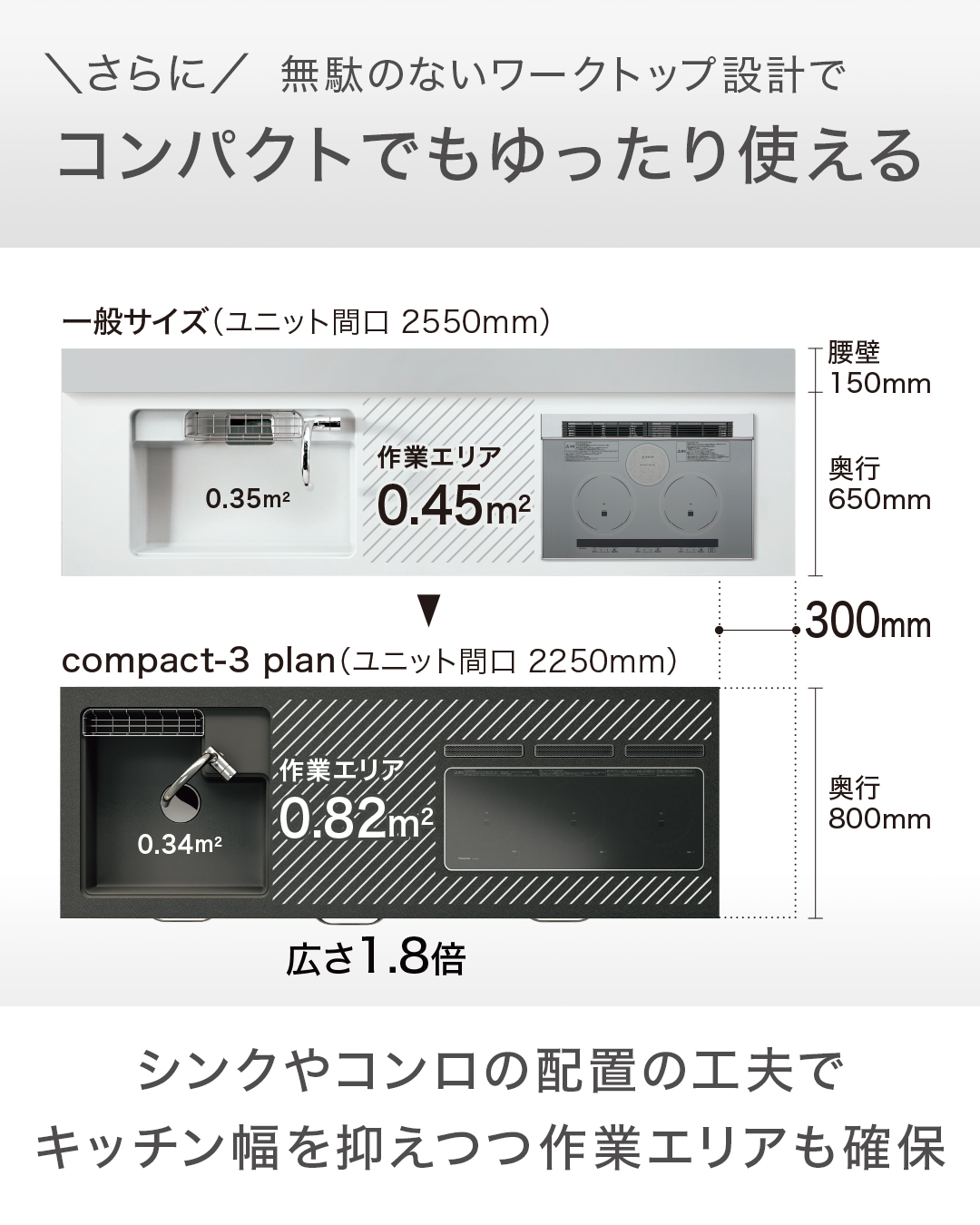 さらに、無駄のないワークトップ設計で、一般的なキッチンよりも横幅を抑えながら広々とした作業スペースを実現。高機能と広々としたワークトップで、多様な生活シーンに対応できます。