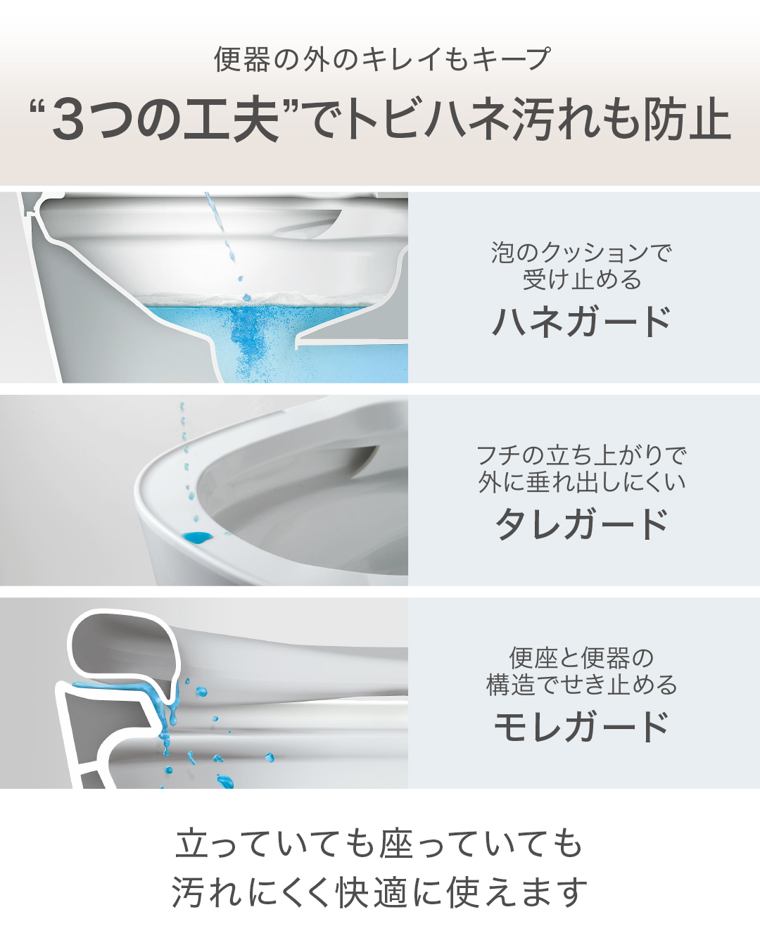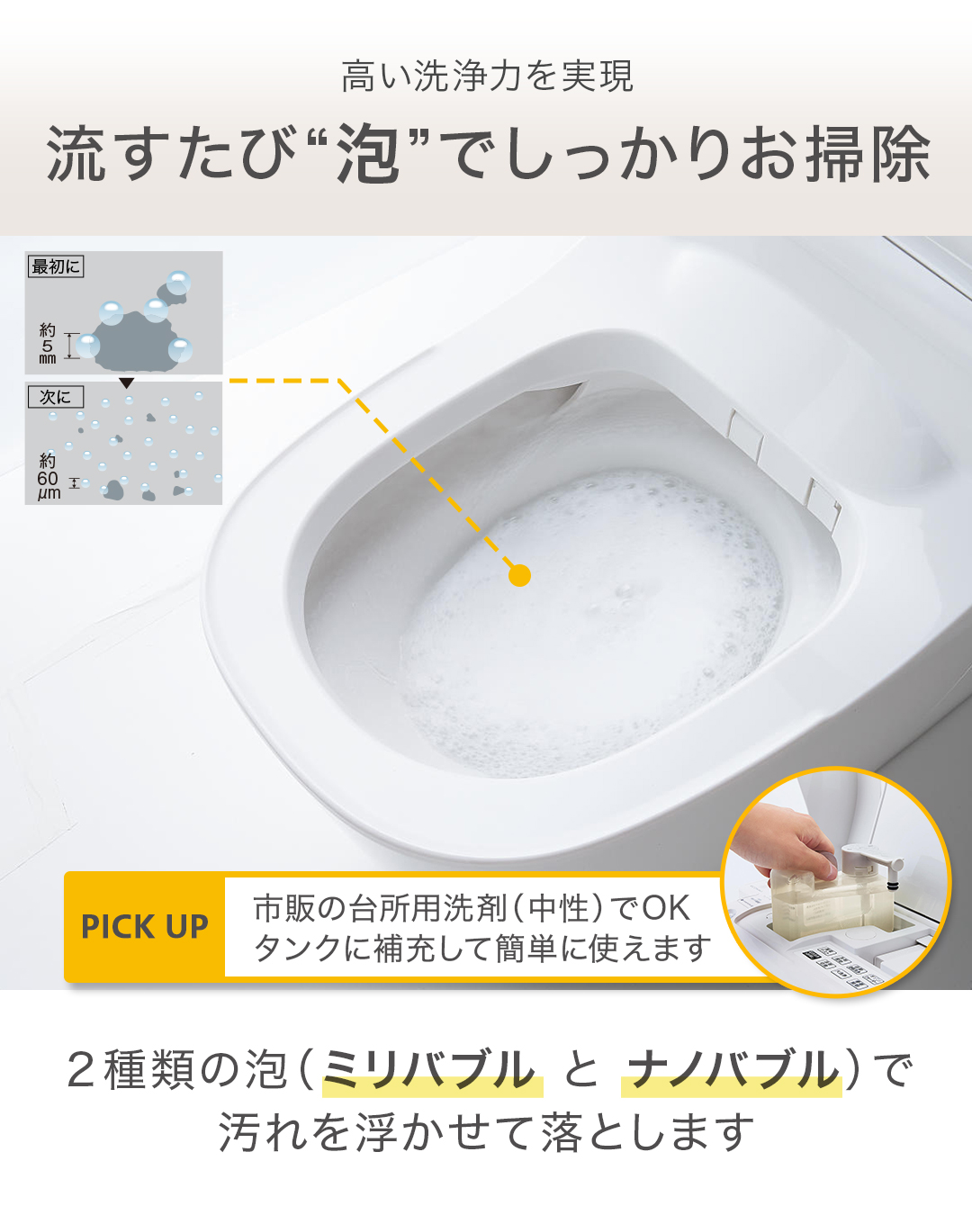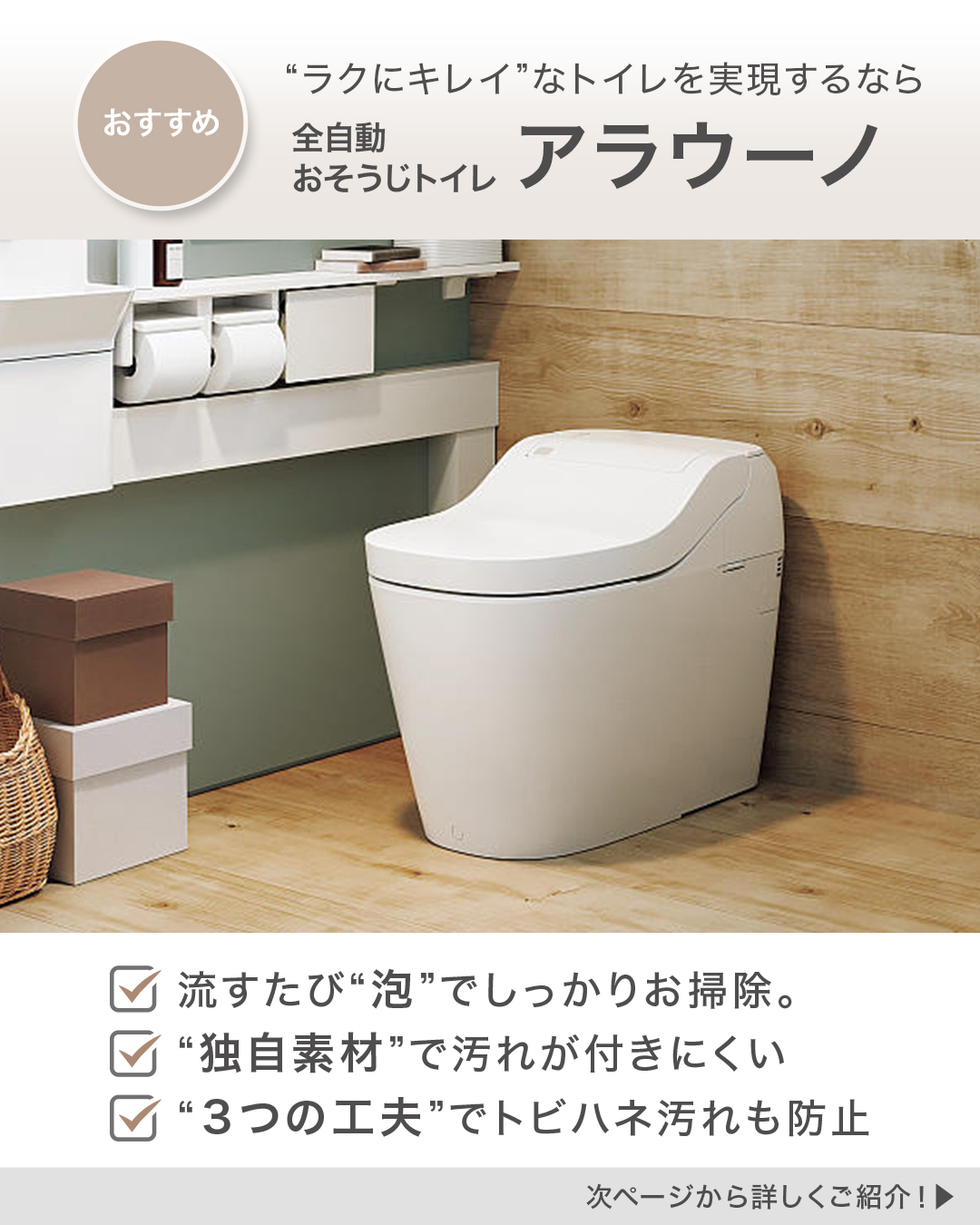 キレイなトイレ空間をラクにキープしたいなら、パナソニックの全自動おそうじトイレ「#アラウーノ 」がおすすめ。流すたびに泡の力でしっかりとお掃除することで高い洗浄力を実現。独自素材で水アカの固着を防ぐのでぬめりや黒ズミもつきにくく、設計の工夫により空間への「トビハネ汚れ」にも配慮しており、立っても座ってもキレイに・快適に使えます。