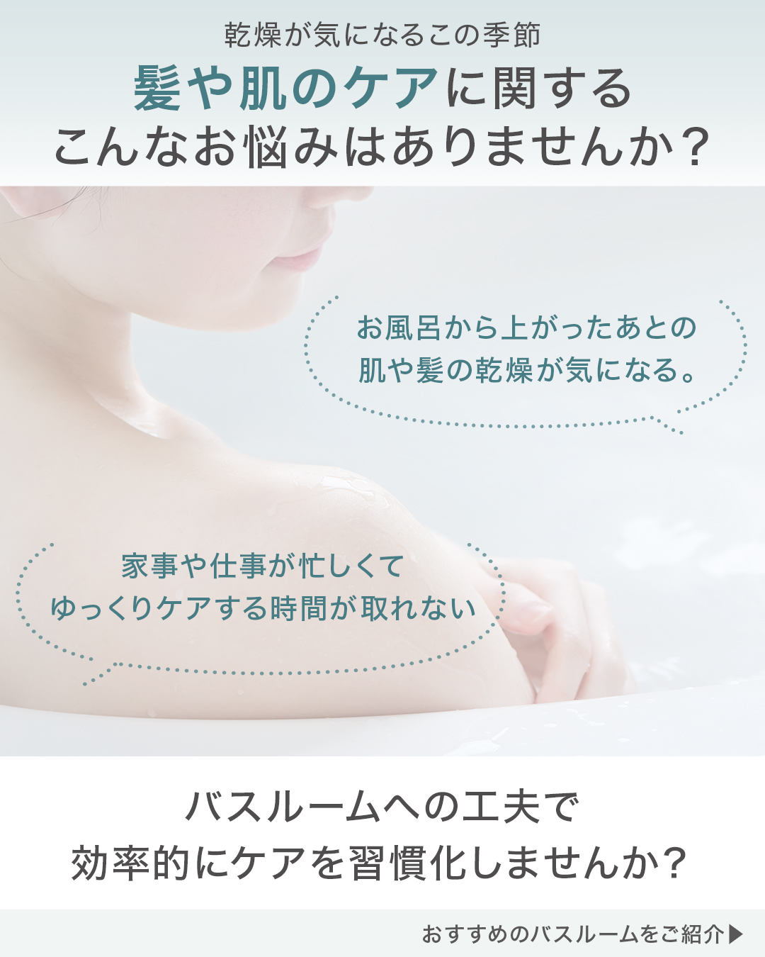 乾燥が気になるこの季節。お風呂あがりに、肌や髪がいつもより乾いていると感じることはありませんか?きちんとケアしないといけないとは思っていても、ゆったりとセルフケアの時間を取るのは難しいもの…。忙しい毎日の中で肌や髪のケアを手間なく習慣化するなら、毎日のバスタイムに注目するのがおすすめです。