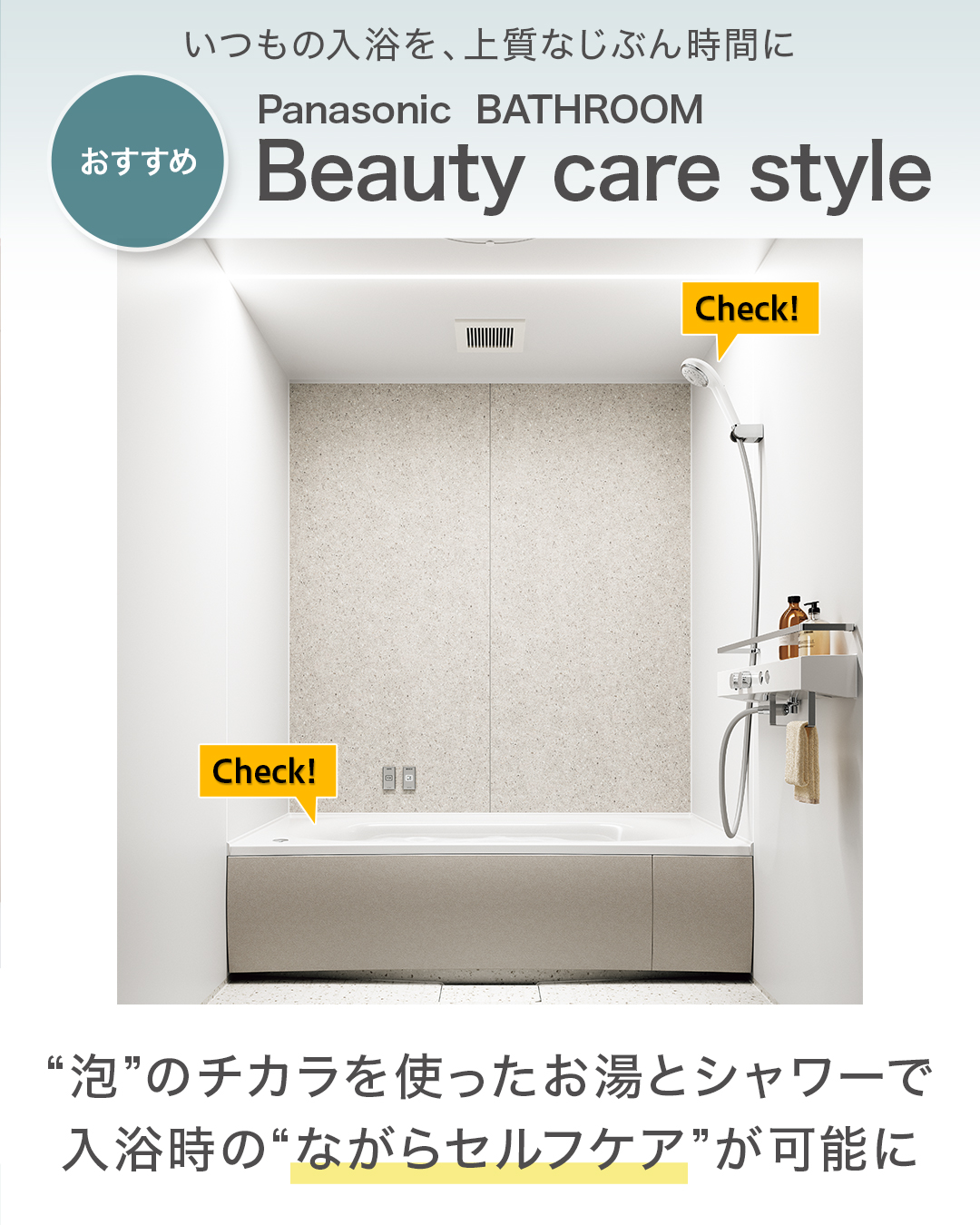 PanasonicBATHROOMの新プラン「Beauty care style」は、泡の持つチカラに注目した新しいバスルーム。湯あがり後のうるおいを長続きさせる「#オイルヴェール酸素美泡湯 」、ファインバブルと5つのモードでヘアケアの効果を高めてくれる、「ファインバブルシャワーヘッド#ファインベール 」で、入浴ついでの“ながらセルフケア”が可能。入浴時にカンタンに無理なくセルフケアが可能です。