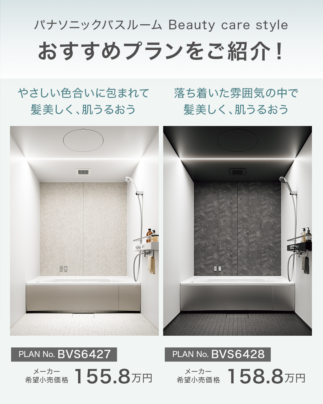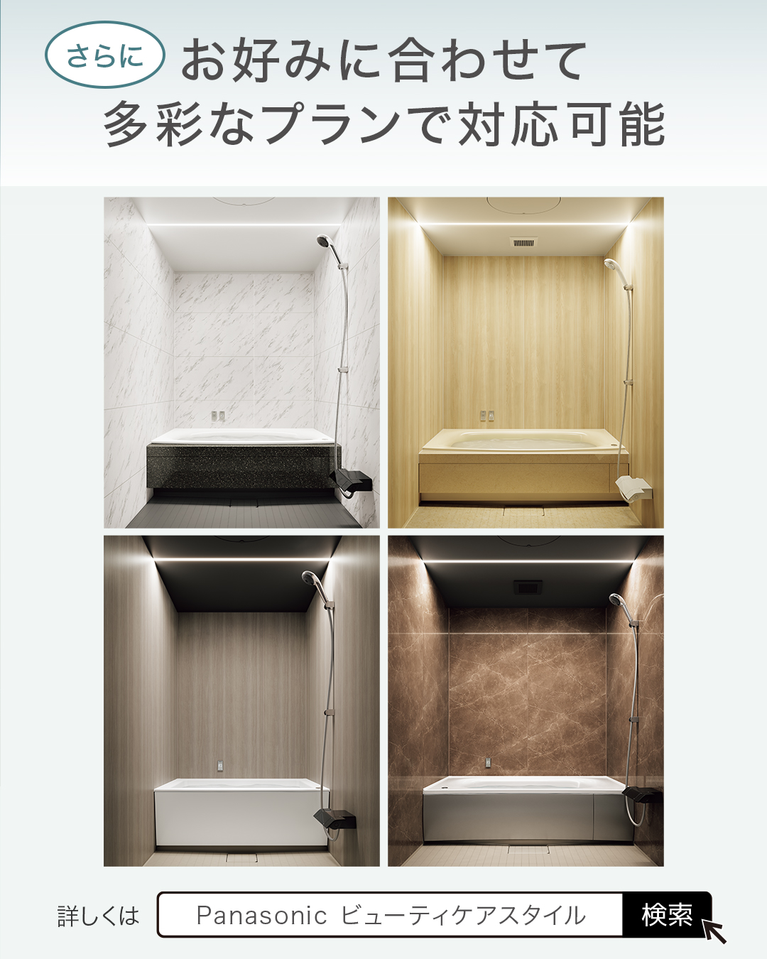 さらに、住まいの雰囲気に合わせて多彩なプランで対応が可能。パナソニックならではの「#フラットラインLED 」を取り入れれば、洗練されたバスルームを演出することもできます。