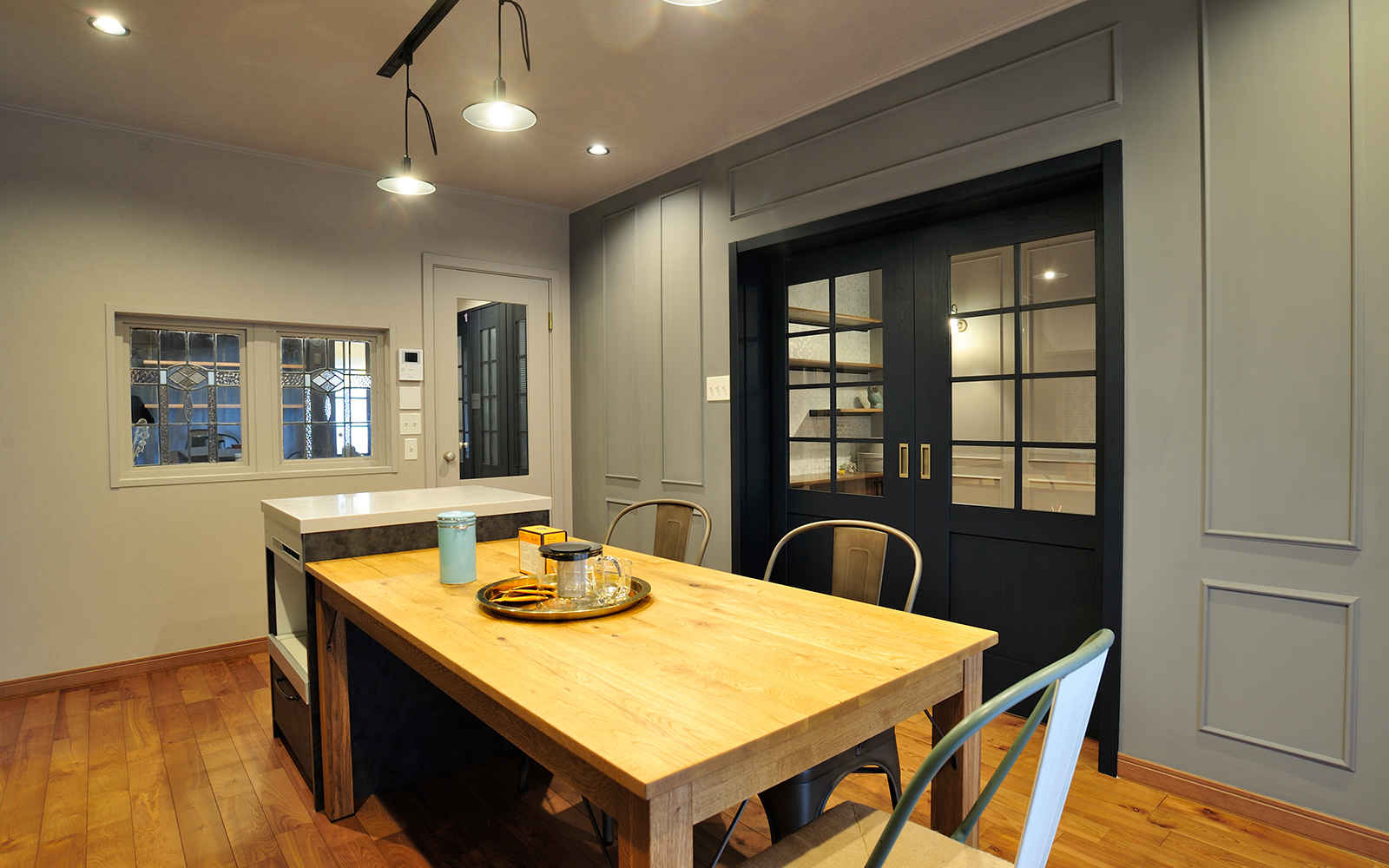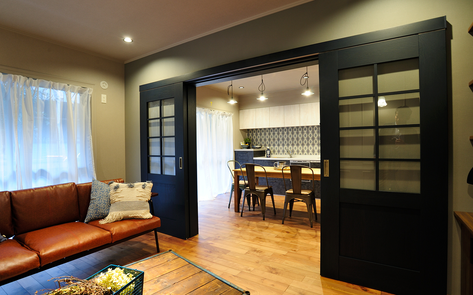 VERITIS(ベリティス)のネイビーオークの引き戸を採用しました。我々のお客さまは、天然素材を選ばれる方が多いんです。たとえば日本の住宅は9割5部がプリント素材のシートフローリングだとも言われていて。やっぱり天然素材は年々、見方によっては劣化、視点を変えれば味が出てくる。そうした変化に対するクレームが多いことを理由に、あまり使われなくなってきた。一方で、天然素材を使ってこだわりのリノベーションをしたいという人がいるのも事実。
