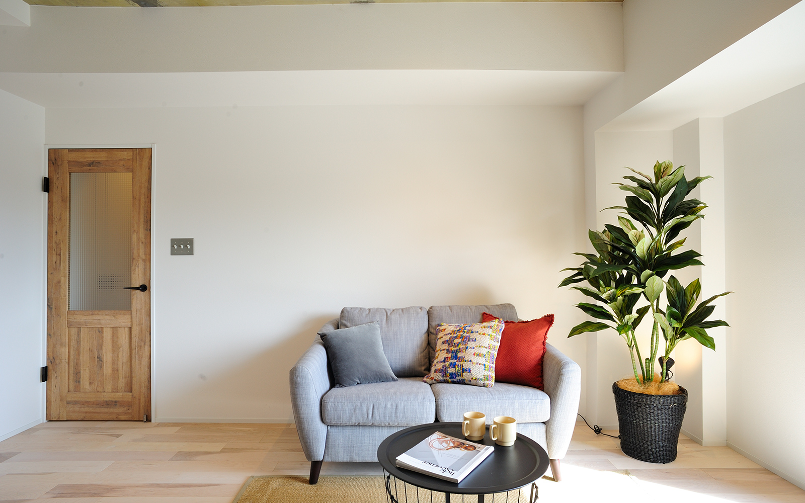 味のある天然素材に馴染む、ベリティスのドア。まずは素地のまま始めるのもいい。DIYで塗ってみるのもいい。家族のかたちや自分の好みが変化していく、30年後も「いい家」だと思えるように。住環境ジャパンは、安心でわかりやすい「定額制のワンストップリノベーション」を軸に、変化も楽しめる心地の良い空間をつくっていく。