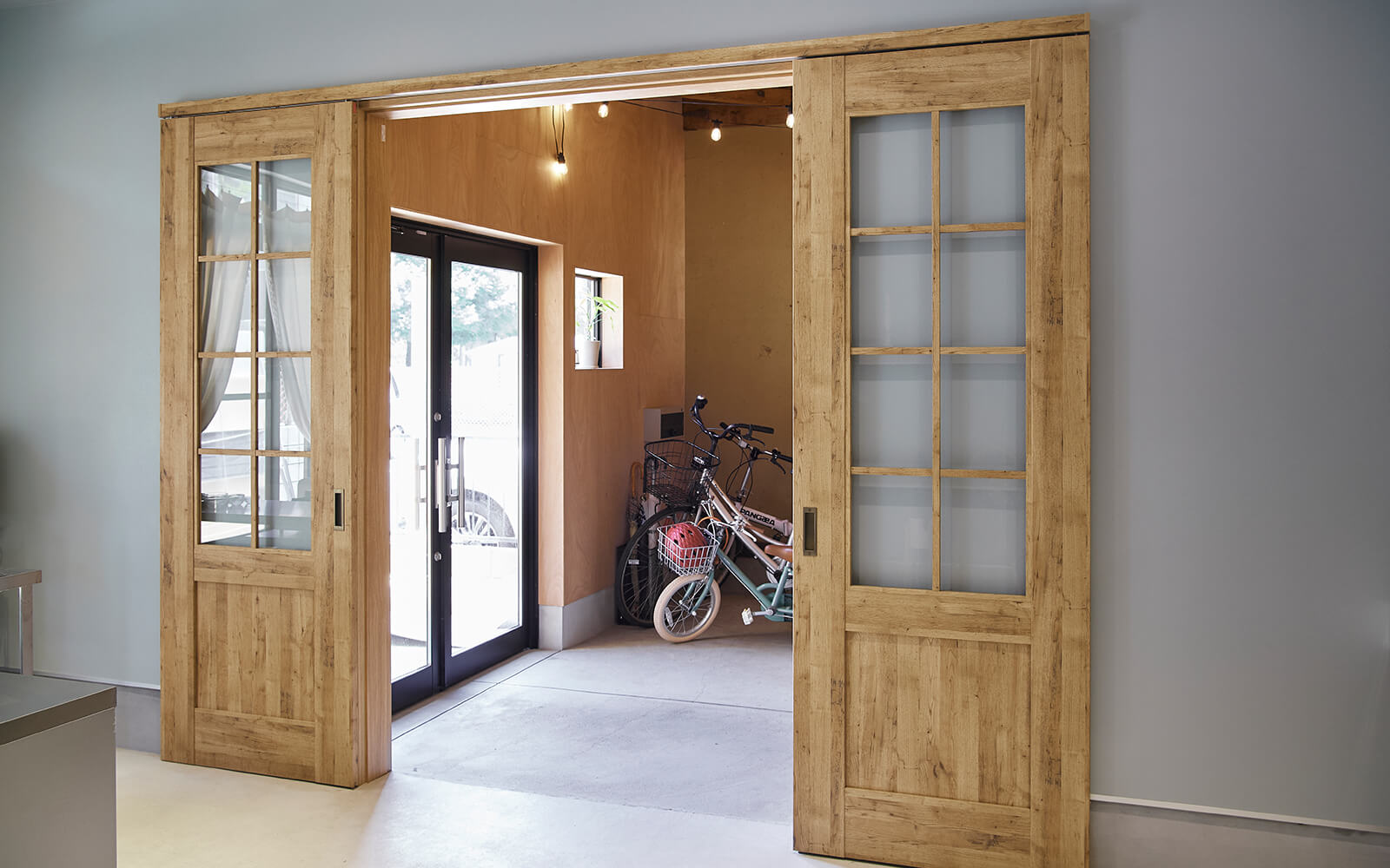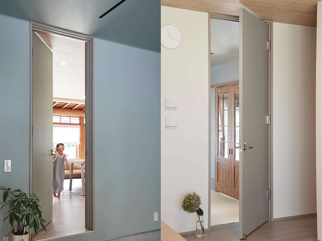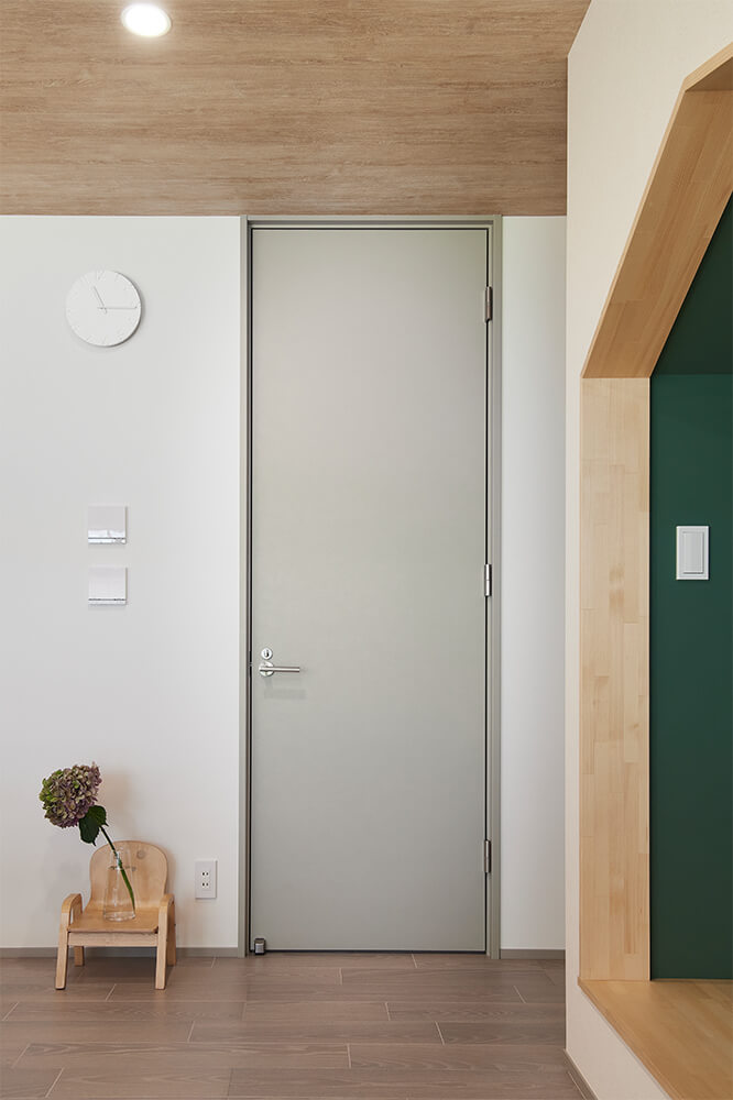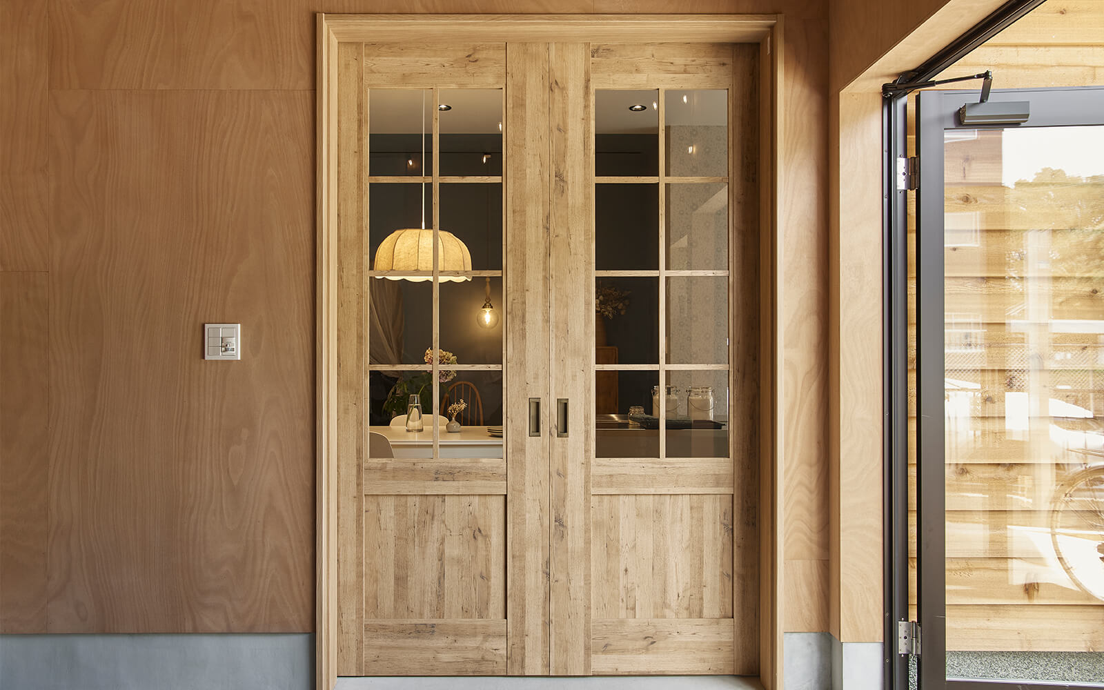 加奈絵さん「背の高いドアは、開放感があって空間を広く見せてくれます。玄関や階段につながるドアをガラス戸にしたのは、子どもが帰ってきたときや2階の部屋から降りてくるときなど、ちゃんと気配を感じたいと思ったから。同じ色で統一しながら、ドア一つ一つのデザインを選べるのも魅力的ですよね。選択肢の多さと見た目のデザイン性だけじゃなく、ソフトクローズで引き戸がバンっと閉まらず、使い心地がいいところもお気に入りです」