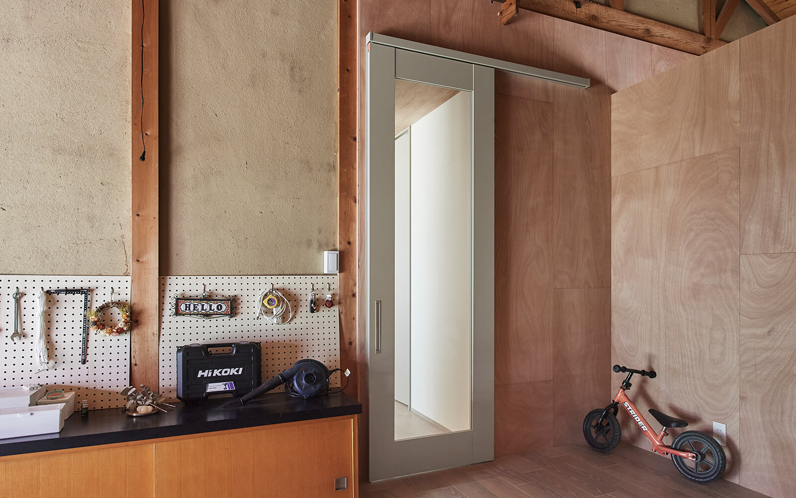 床を打ち抜いた土間に位置するアトリエは、ベリティス Standard Label(スタンダードレーベル)PA型 パールグレー柄のドアを通じて、リビングにつながる。扉を開ければ、子どもたちの姿も見える。