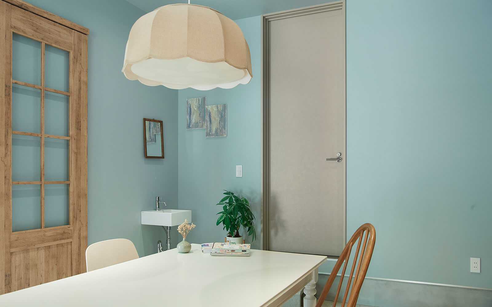 加奈絵さん「タブチさんとTOMOMIさんが好みを熟知してくださっていたので、ドアも壁紙も自分たちにとって心地のよい選択ができました。パールグレー柄のドアは、のっぺりしたグレーじゃなく、素材感があって、目を凝らすと貝殻のような輝きがあって美しいんです」