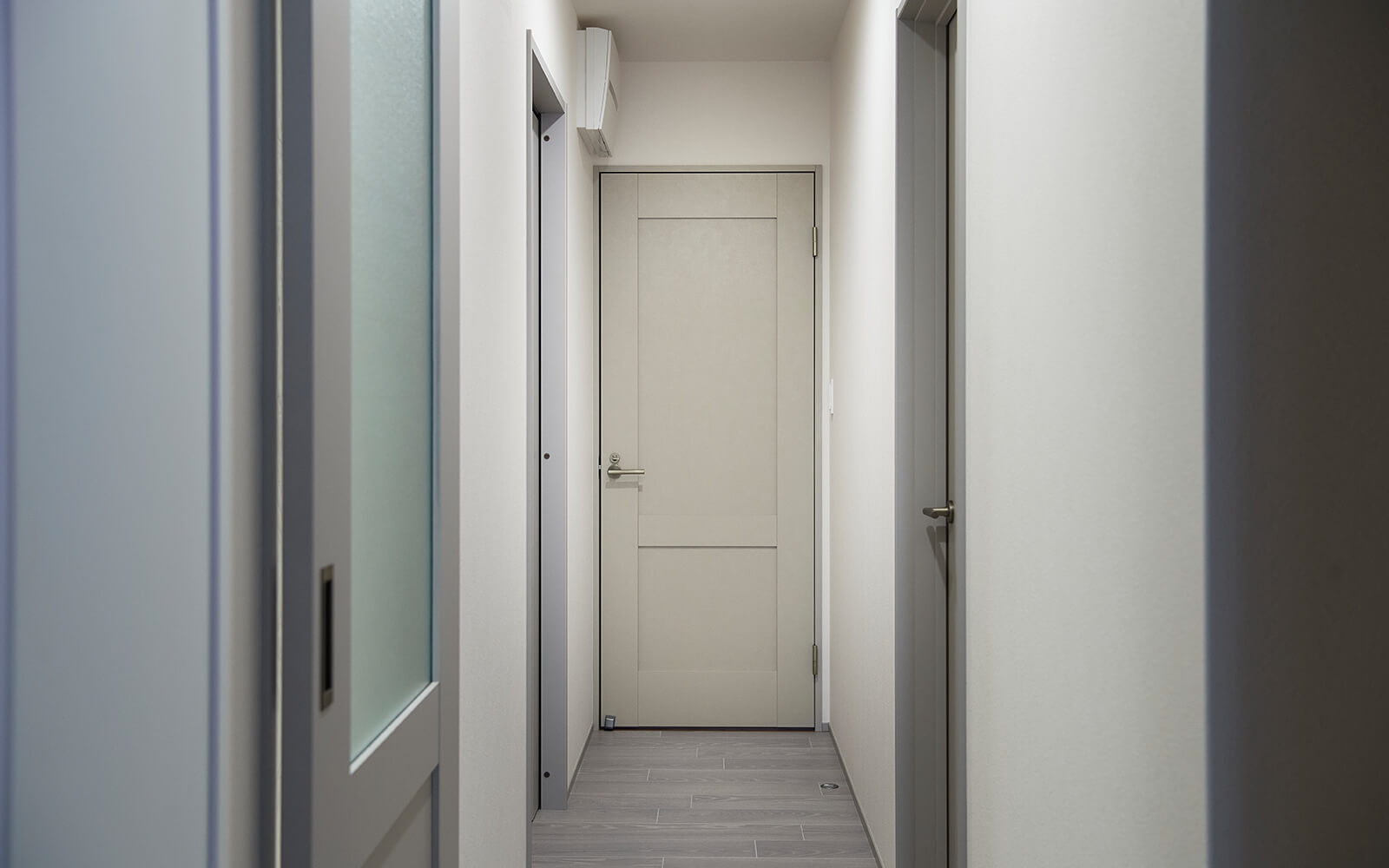 リビングにつながる3箇所のドアのほか、廊下に連なるトイレや洗面所、寝室のドアもベリティス クラフトレーベルのパールグレー柄で統一した。