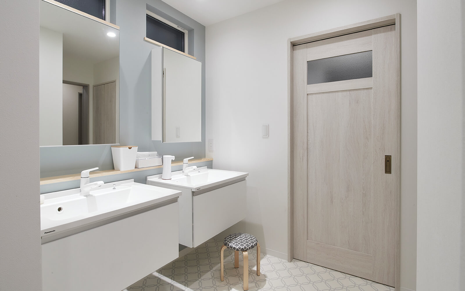 洗面室の中のドアは、ベリティス クラフトレーベル DE型 ホワイトオーク柄を採用。