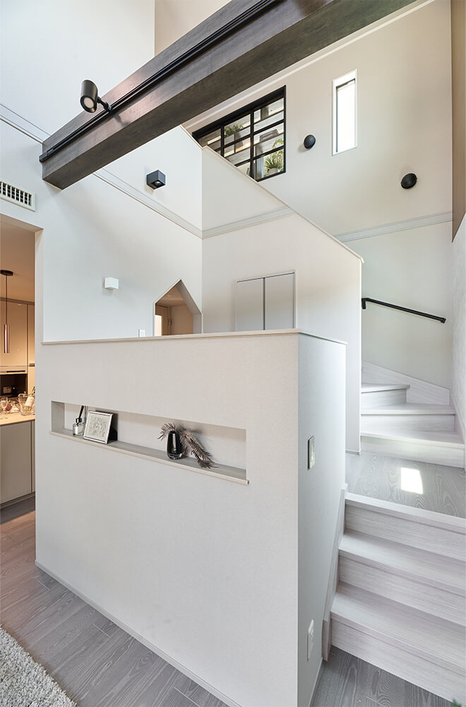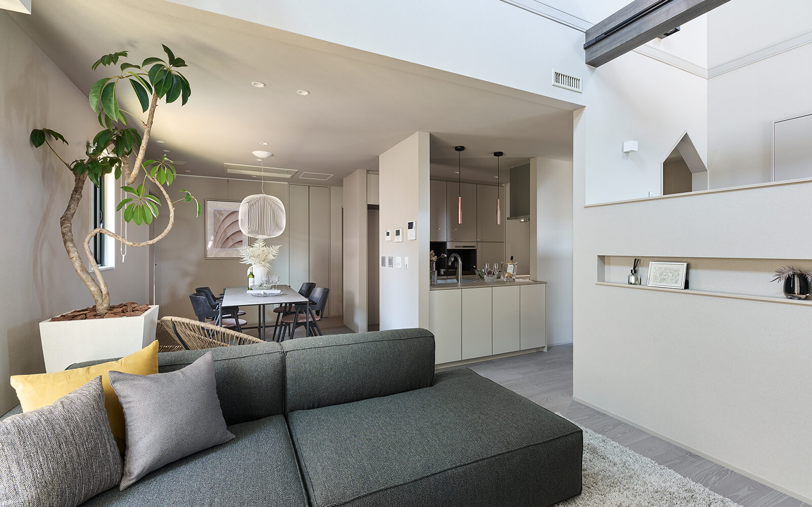 福岡にある戸建のモデルルーム。吹き抜けのある全館空調の開放的な空間には、優しい光が差し込み、穏やかな空気が巡る。明るすぎず暗すぎないグレーを基調に、上品で柔らかな雰囲気が広がっている。