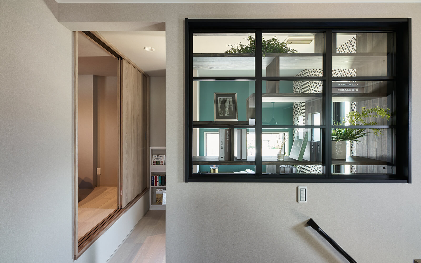 全館空調という機能的な特徴から、空間自体も境界線が曖昧になっています。リビングで家族全員がぴったり一緒にいるというよりは、それぞれ個別の部屋で過ごしながらも、なんとなく気配を感じつつ、一緒にいる。たとえば、2階にあるワークスペースに、VERITIS(ベリティス)の室内窓を使って、部屋の中がなんとなく見えて、空気が循環するようにしています。