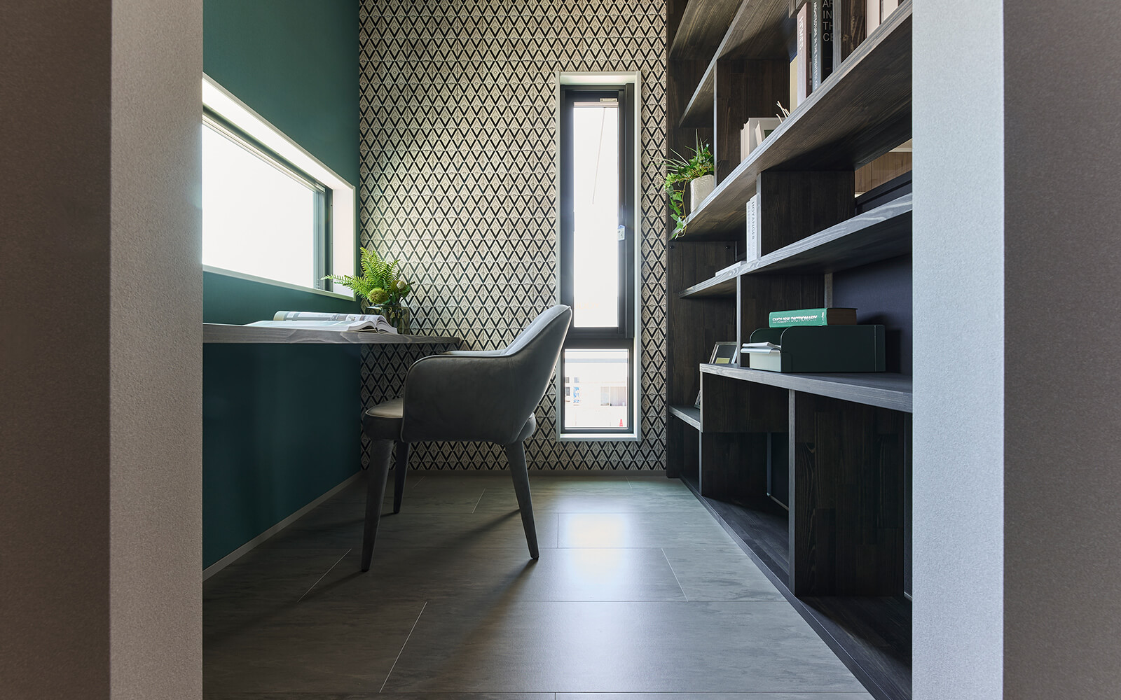 ドアのない書斎の床は、天然石やモルタルの質感があるラピスタイルフロアーのモルタルグレー(石質仕上げ材)にして雰囲気を変えています。連なる床も同じグレーが基調になっているので、素材感や明るみが違っても、違和感なく馴染んでいると思いますね。