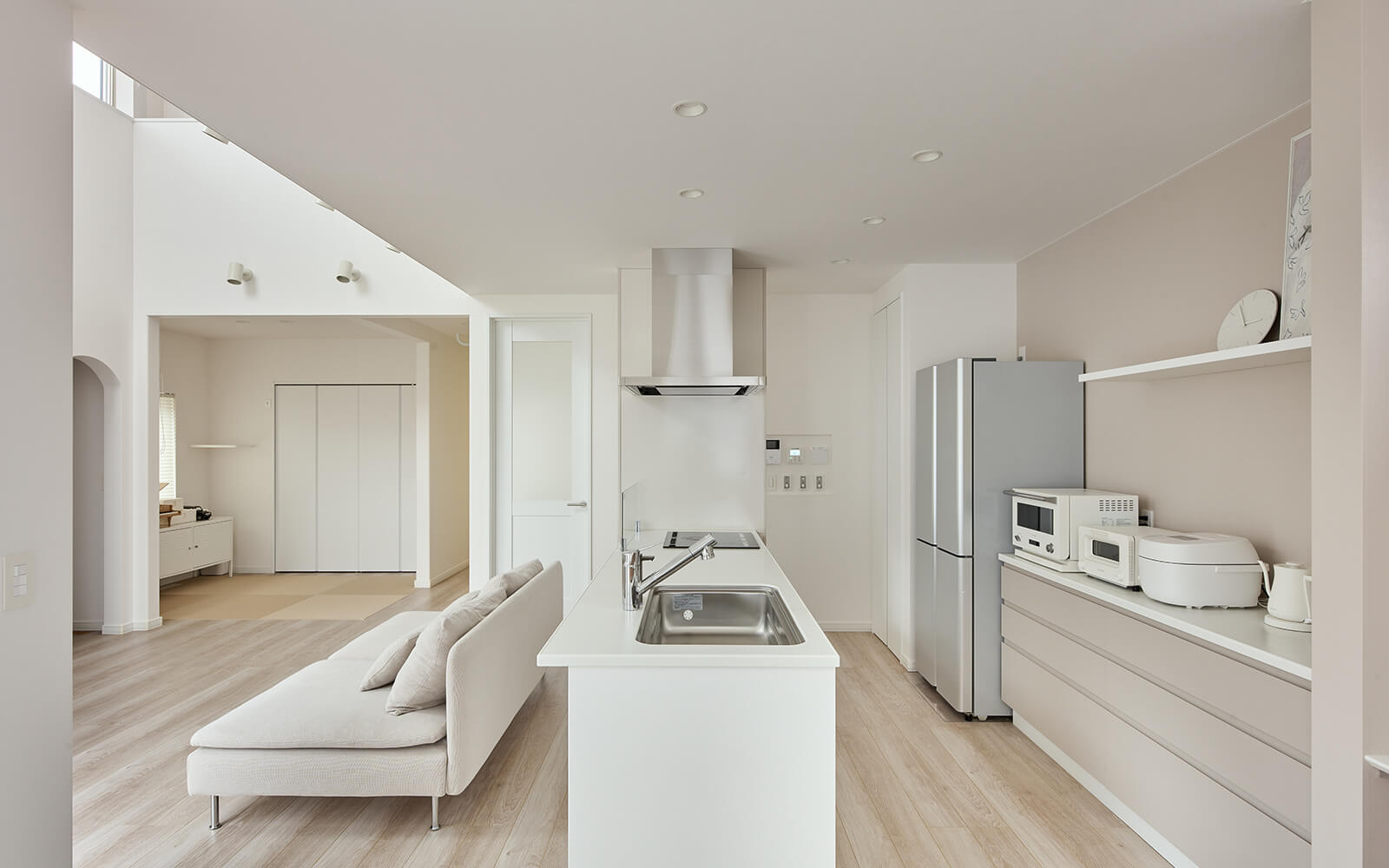 キッチンも白を選び、背面にあるカップボードのみ差し色としてグレージュを選定。