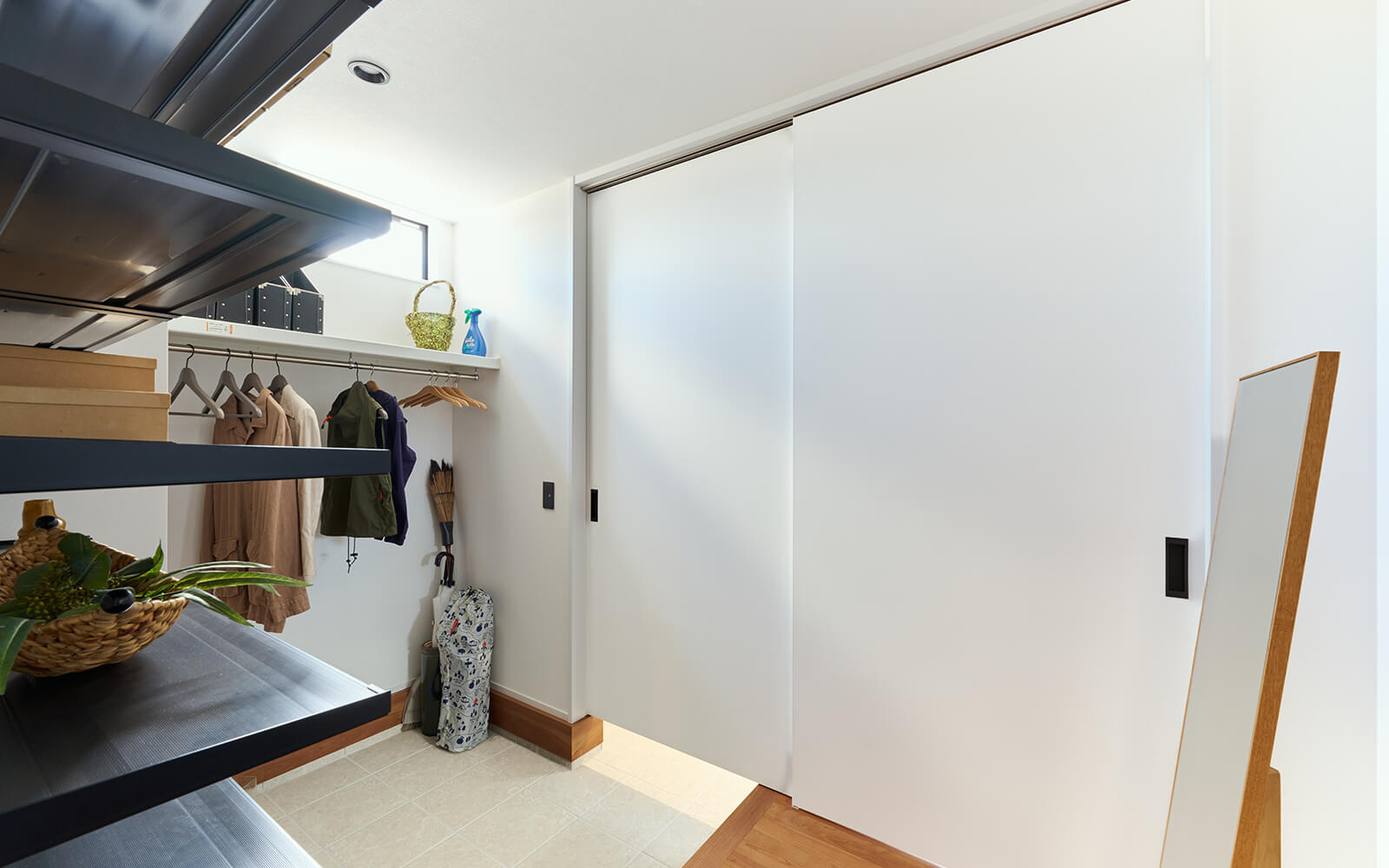 玄関には土間収納があって、靴だけでなく男児のスポーツの道具を置いて扉で隠せるようにしています。直接ダイニングからキッチンにも行けるので、買い物からの動線も楽です。