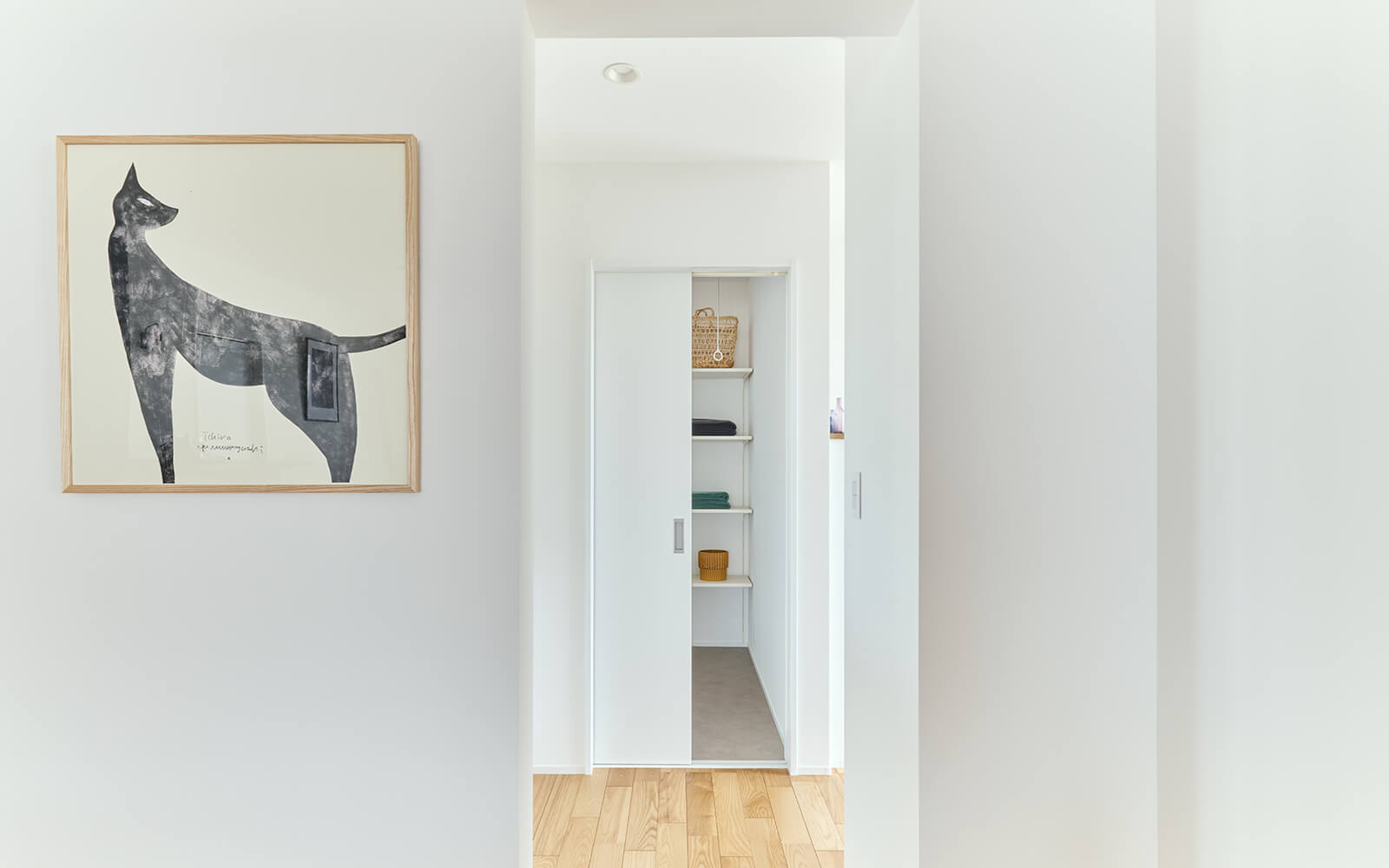 寝室は扉で仕切って夫婦別で寝ることができ、予備室は旦那さまの趣味部屋として使うことを想定しています。スポットライトとピクチャーレールをつけて、絵を描いたり洋服を飾ったり。ほかにもこの地域の冬は風が強く埃が立つので、洗濯物を中に干せるスペースも設けています。