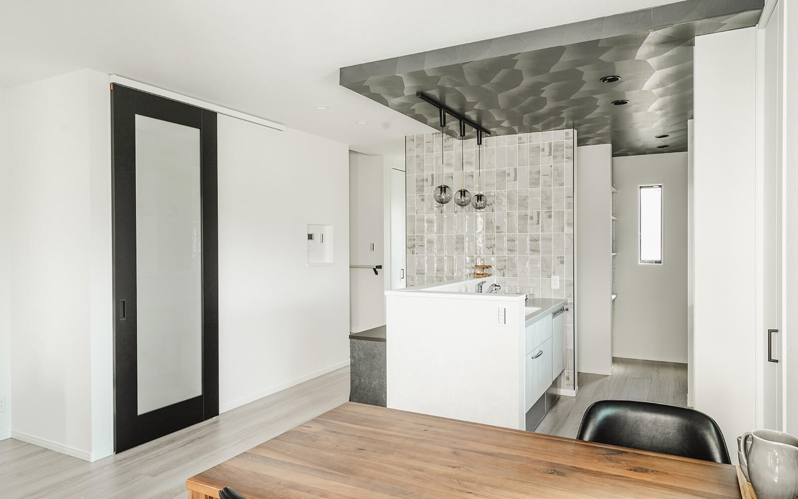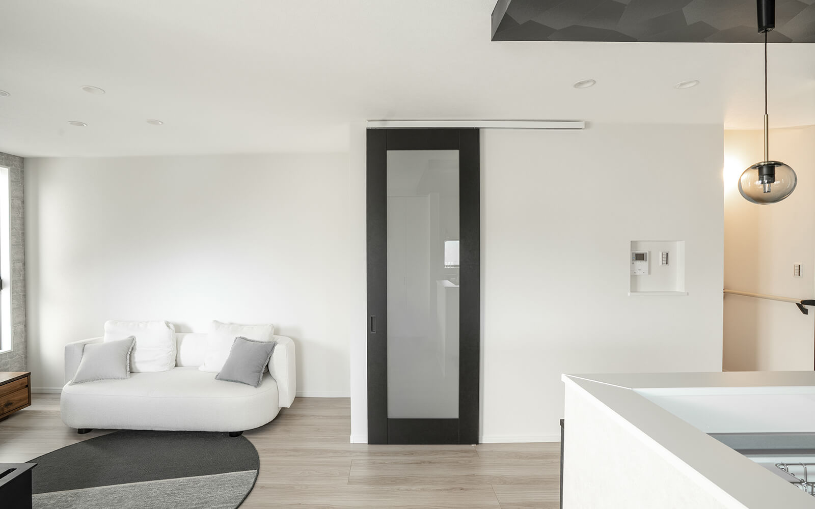 下がり天井はクールなブラックを取り入れて、合わせてリビングドアもソイルブラック柄を選びました。空間にある色味を拾い、あまり主張しないドアとして。