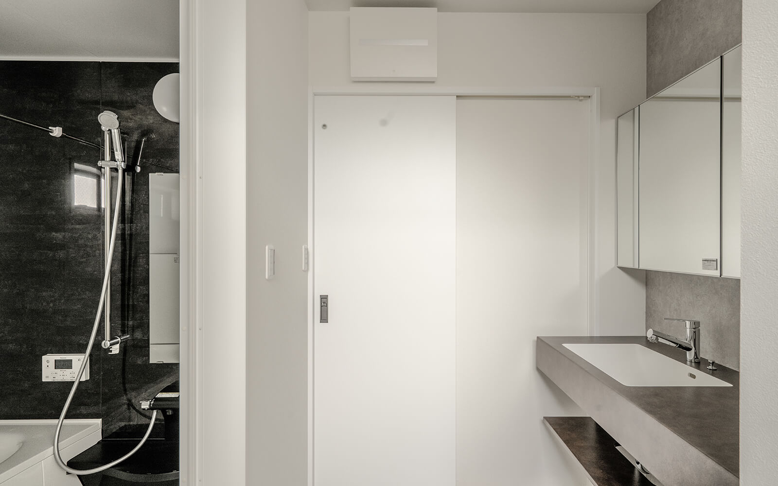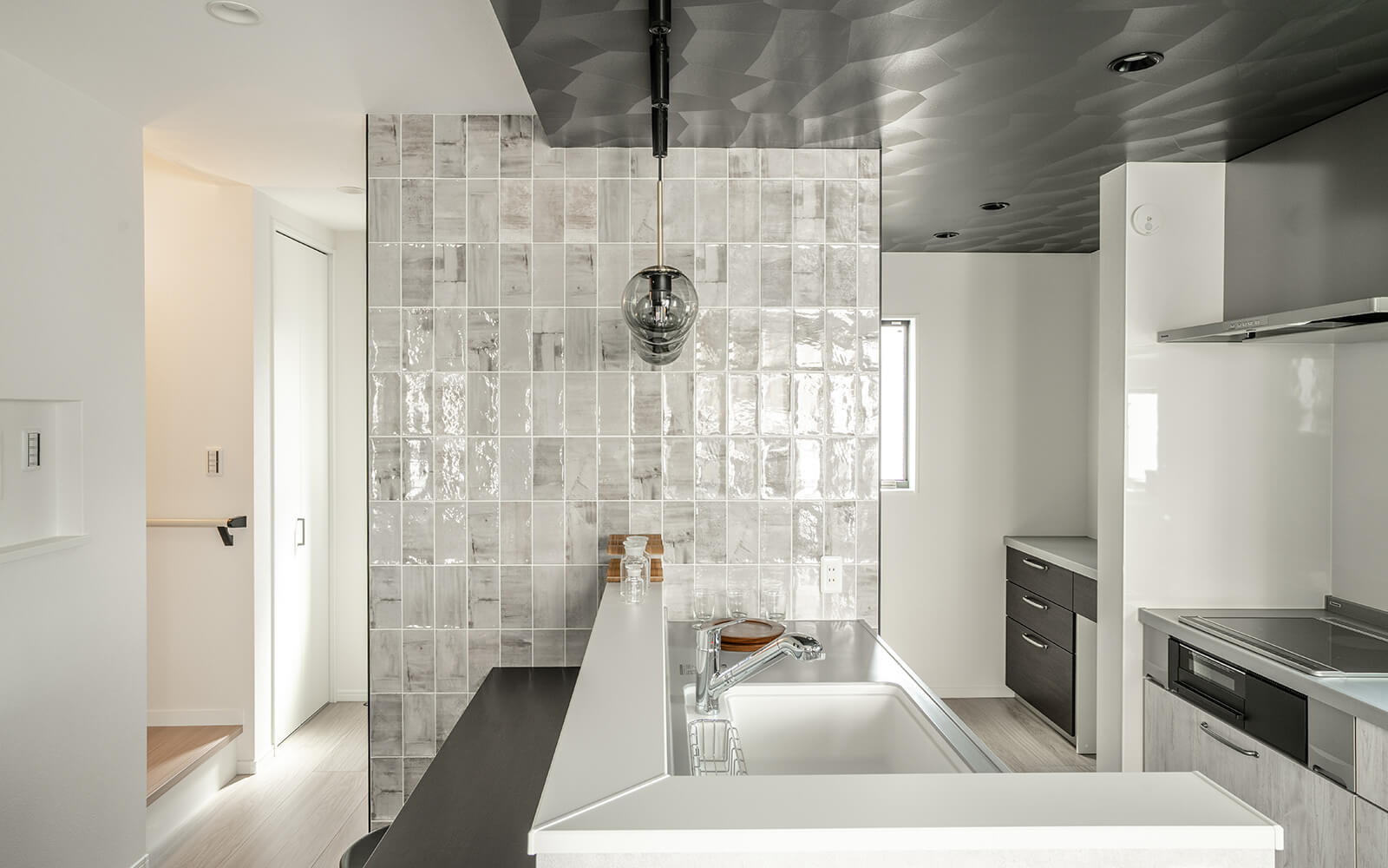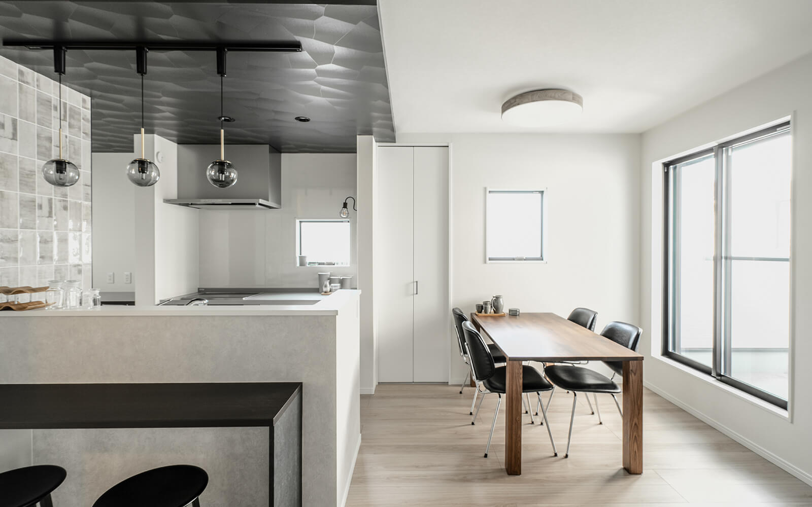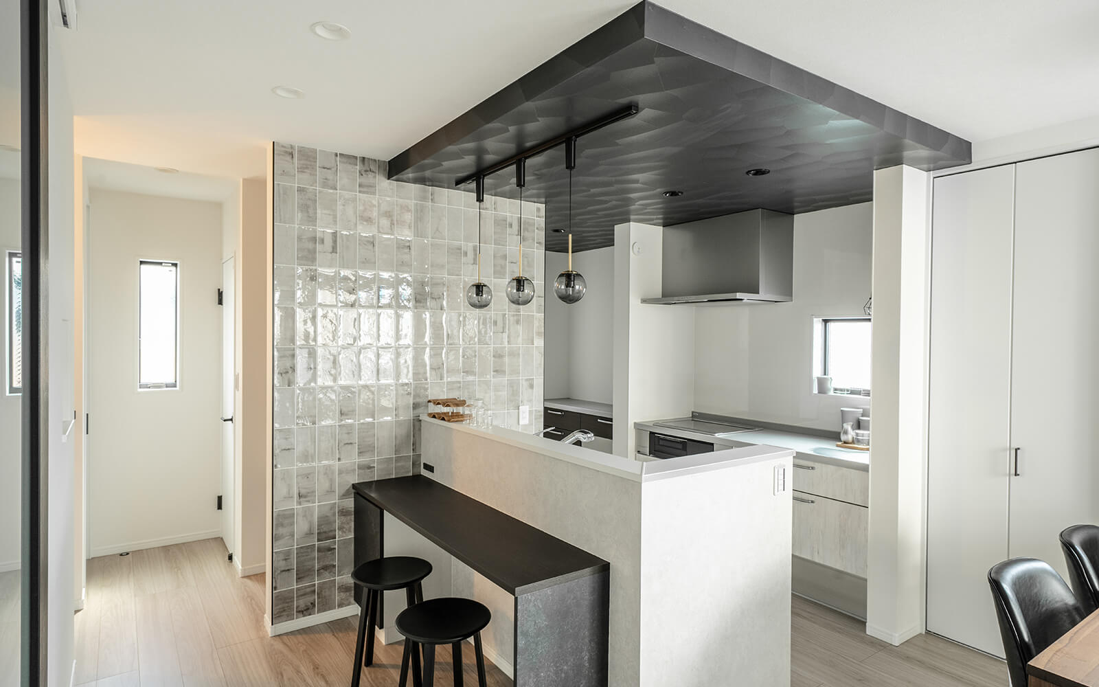 光沢ある石目調のタイルを起点に、モノトーンが奏でるスタイリッシュでモダンな空間。白黒はっきりしたメリハリの中に漂う、やわらかな曖昧さ。内装デザインの延長線上で選び抜かれた家具が調和を保ってくれる。建売であってもほかのどこにもない暮らしの風景が浮かぶ家。エイワハウジングは一棟ずつ、ひとつの家族の「暮らし」を提案し続ける。