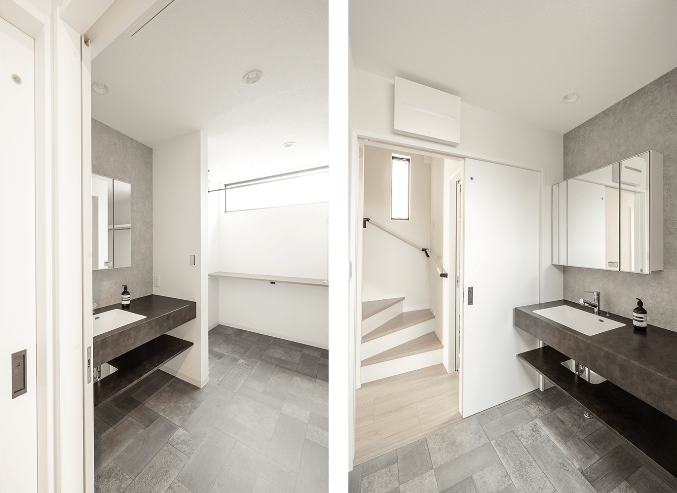池田: 家事をラクにする動線ですね。例えば洗面脱衣室を1階に広めに取っているんです。ランドリースペースとファミリークローゼット、カウンターも設けています。洗濯を回して干して畳んで収納までが一貫してできるように。