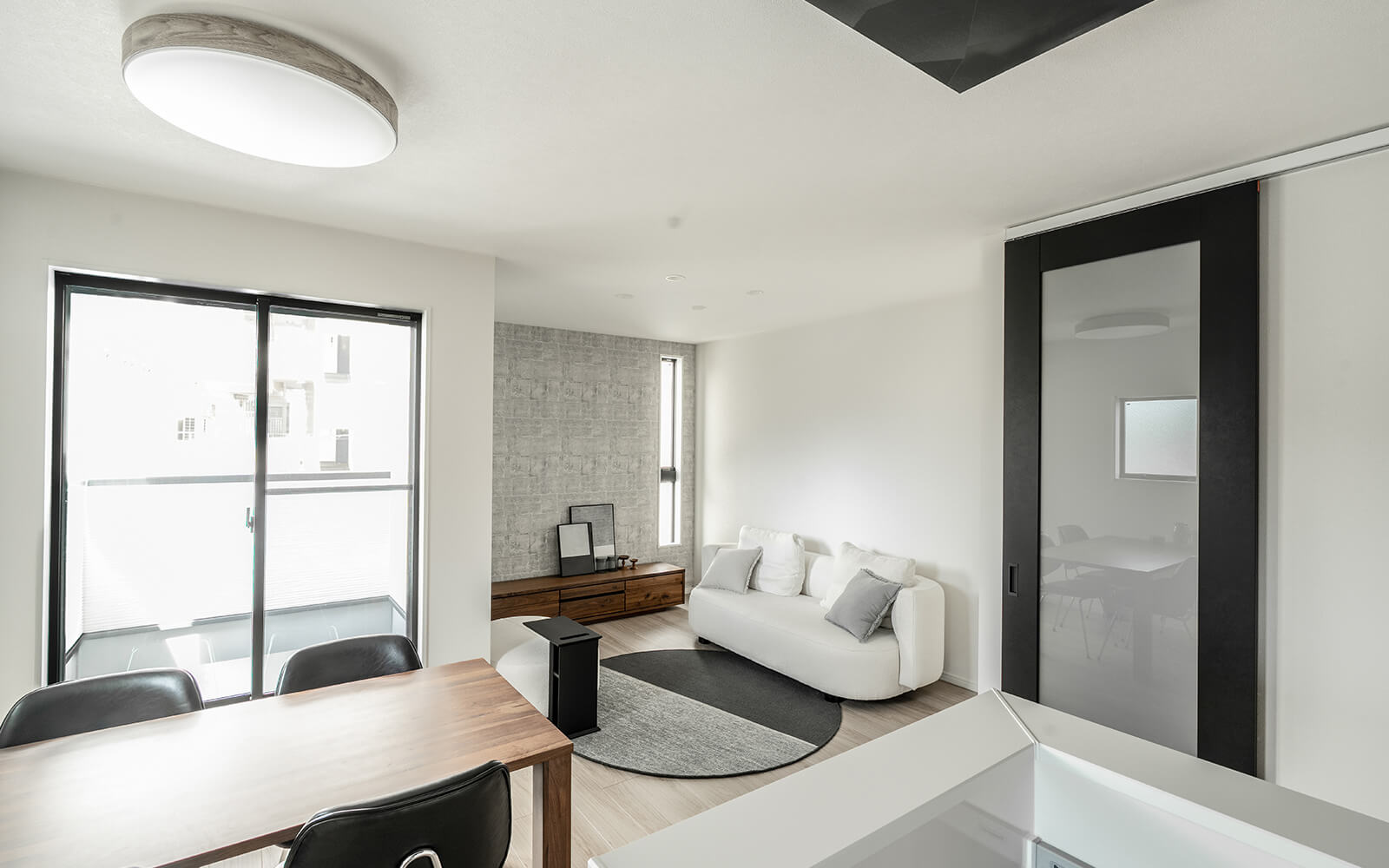 例えばラグは四角ではなく円形に。濃い色味を選んだので、合わせるソファは明るい白色に。サイズも圧迫感が出ないよう小ぶりなものを。今回の物件は吹き抜けがなく一般的な天井の高さなので、高さのある家具は置いていません。