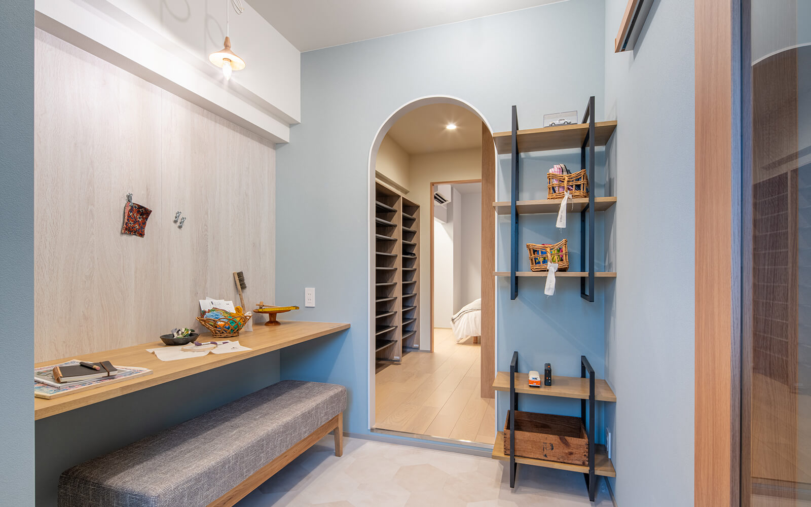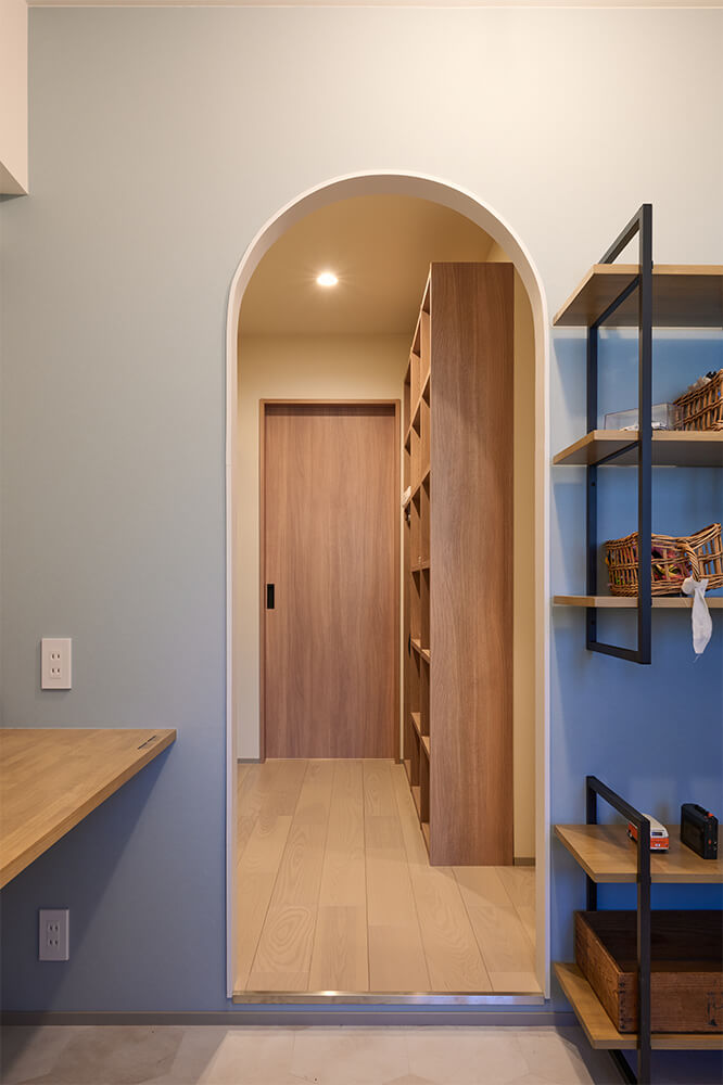 R型のアーチをくぐった土間の奥にはファミリークローゼットがあり、見せる収納も叶います。