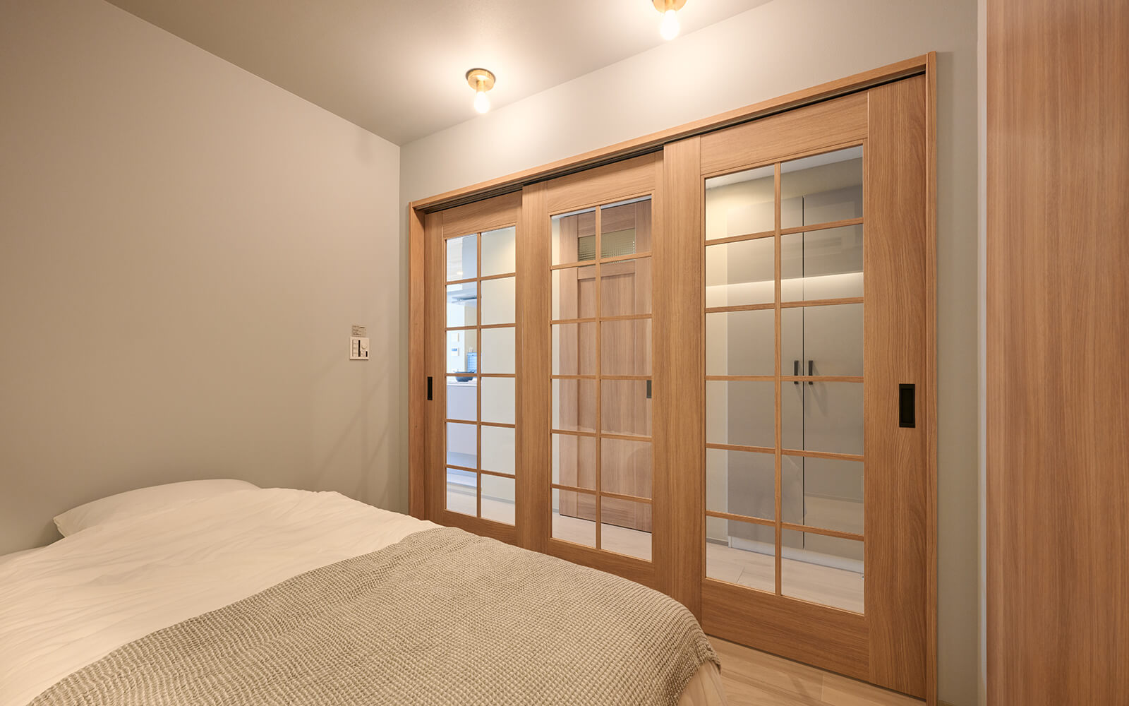 ドア:クラフトレーベルMH型(3連引戸) 採光部:透明熱処理ガラス カラー:イデアオーク柄 引手:C1型 オフブラック色──採光部のある3連の引き戸が狭さを解消しているんですね。