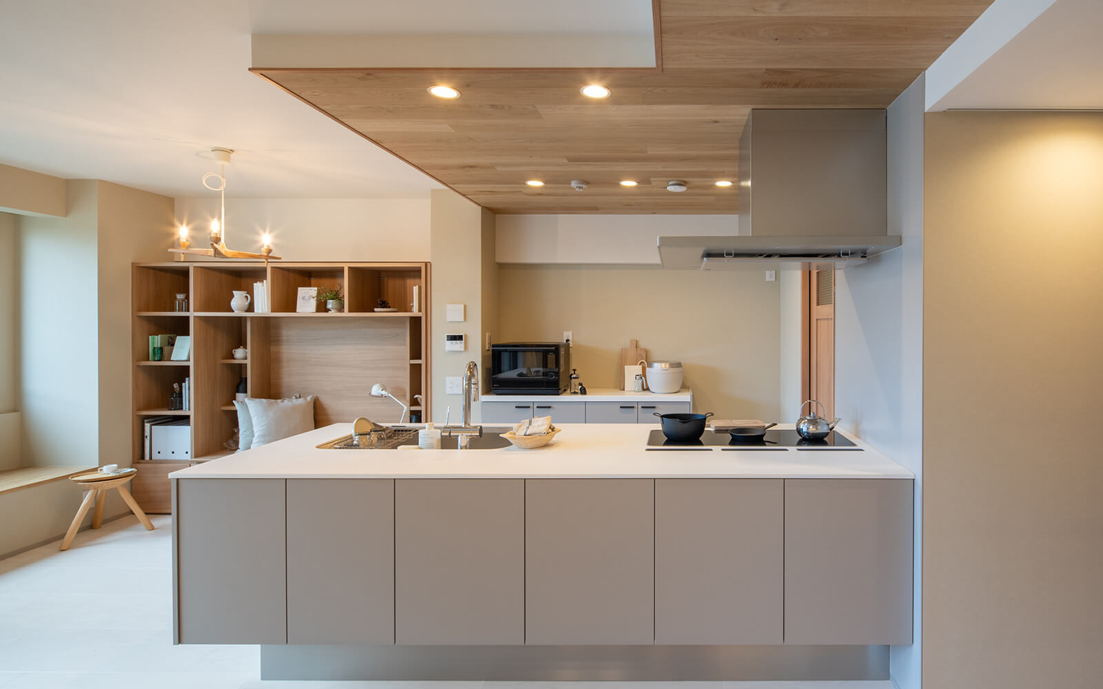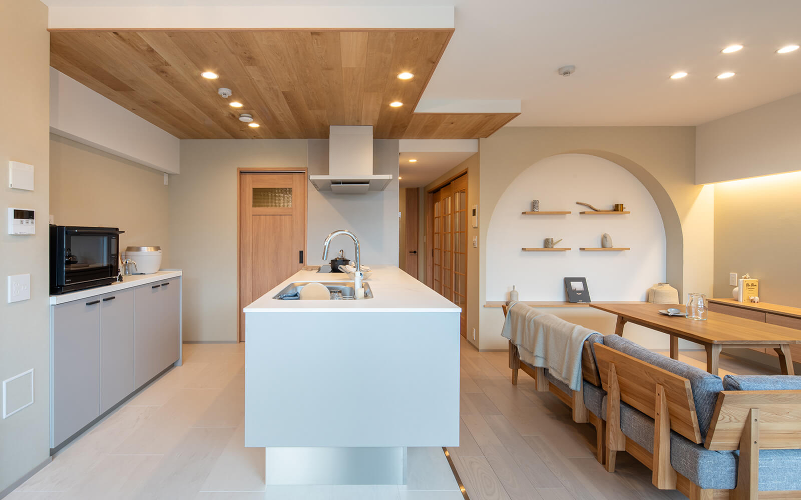 材木屋から始まった弊社のこだわりとして、キッチンの天井には無垢材の突板を入れました。
