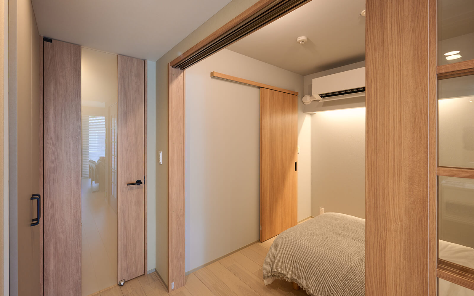 (左)廊下ドア:スタンダードレーベルLD型 採光部:半透明樹脂板 カラー:イデアオーク柄 ハンドル:A2型 オフブラック色(右)居室ドア:スタンダードレーベルPA型 カラー:イデアオーク柄 引手:C1型 オフブラック色