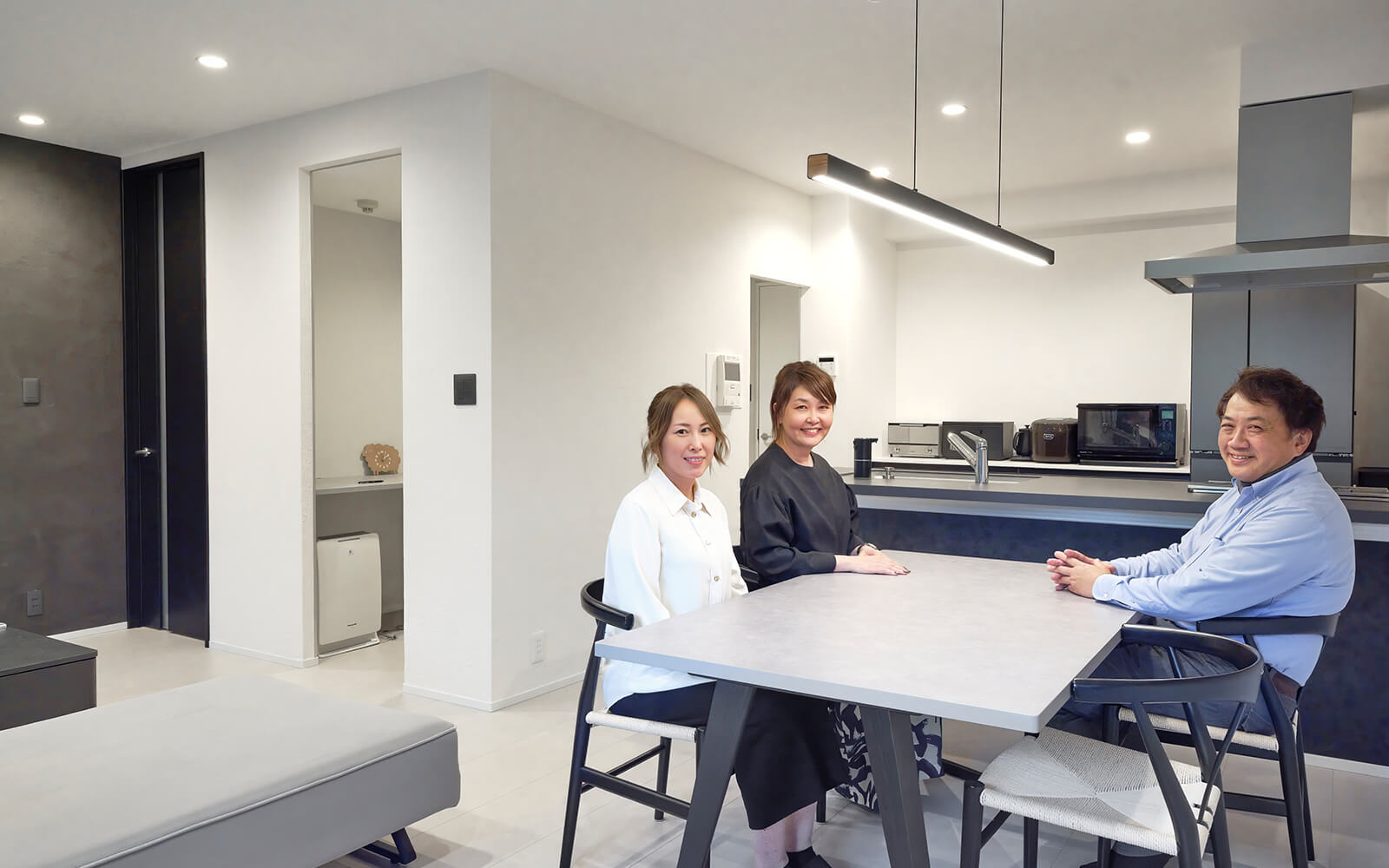 右からルイスデザイン代表取締役で一級建築士の尾﨑博士さん、整理収納アドバイザーでコーディネーターの尾﨑明子さんと坂田利奈さんワンチームで