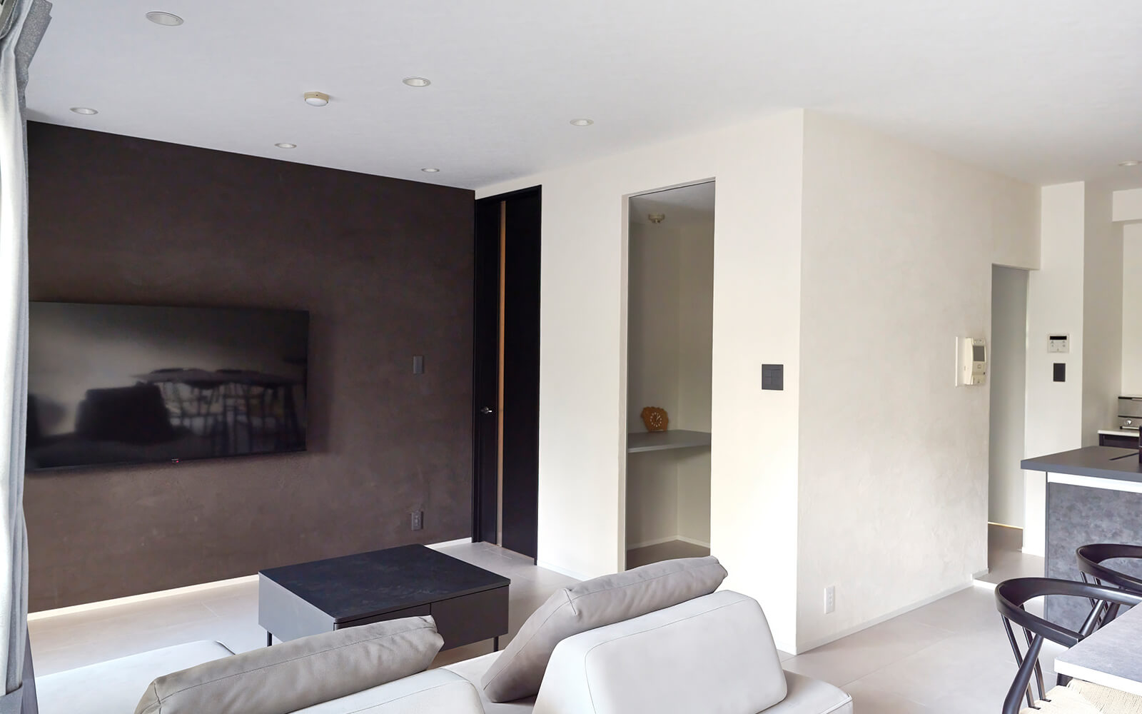 普段使いのスペースは気負わず使えるように、メインのリビングはしっかりとホテルライクに仕上げています。全体として、落ち着きがありながらも、日常の中で無理なく過ごせる雰囲気を大切にしました。