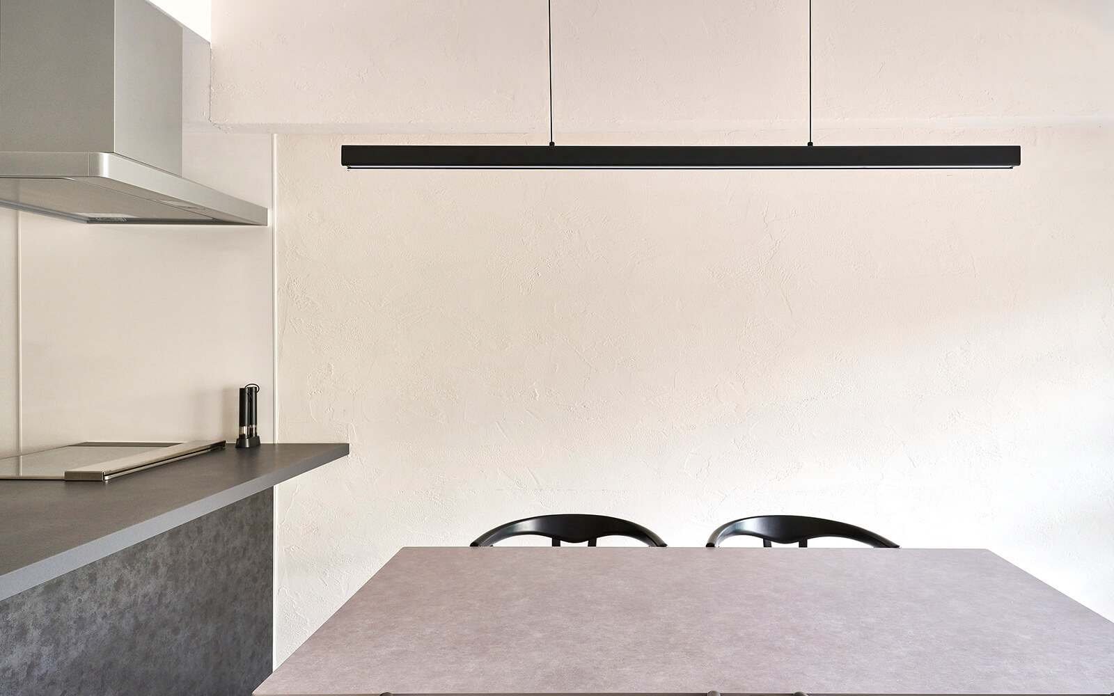 ドア:Standard Label(スタンダードレーベル)PA型 カラー:しっくいホワイト柄 引手:C1型サテンシルバー色尾﨑博士: 今回のこだわりの一つはリビングの壁をしっくいで塗っているところです。自然な風合いが高級感を底上げしてくれるので。全部をしっくいにするのではなく、油汚れがつきやすいキッチンはホワイトのクロスにして、用途に合わせて予算のバランスを取っています。