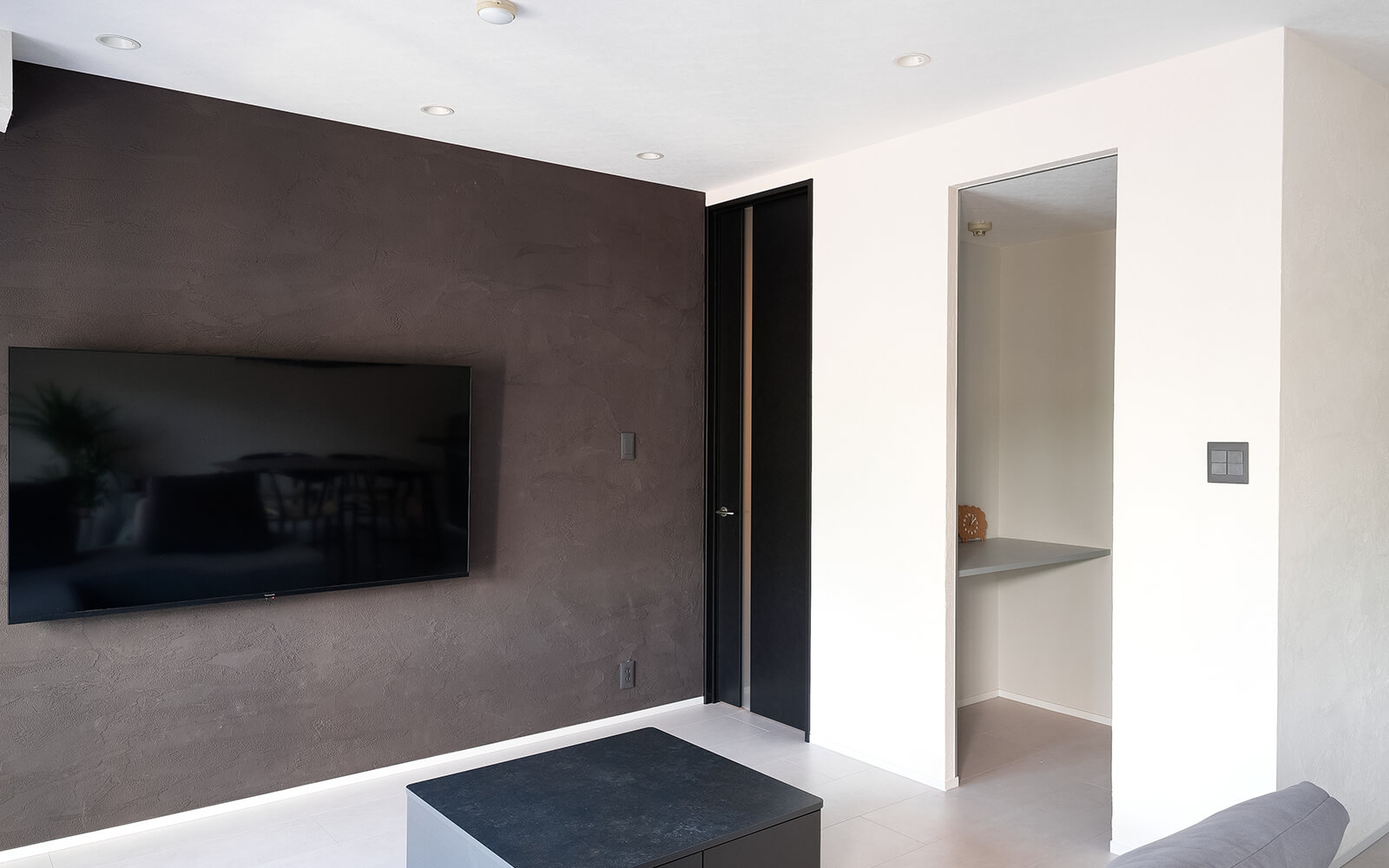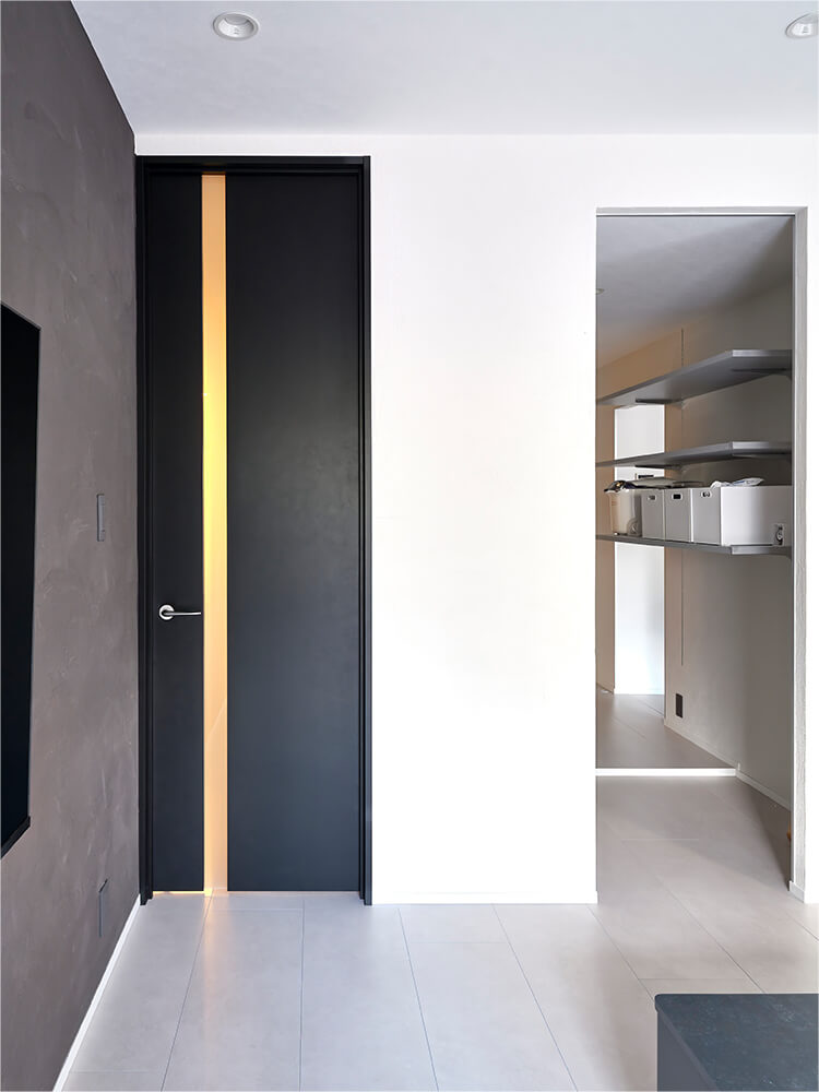 坂田: ドアもVERITIS(ベリティス)のハイドアのソイルブラック柄にすることは決めていました。スタイリッシュに見せたいから採光部は細くして、ハンドルは存在感が出ないシルバー色に。リビング以外のドアは壁に馴染むようにしっくいホワイト柄にしています。