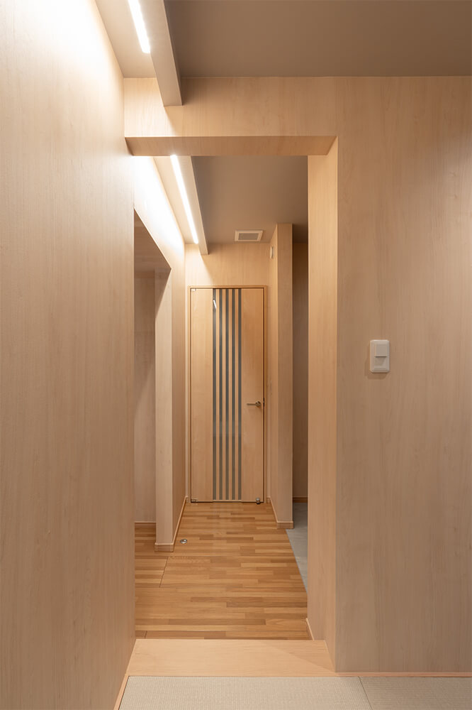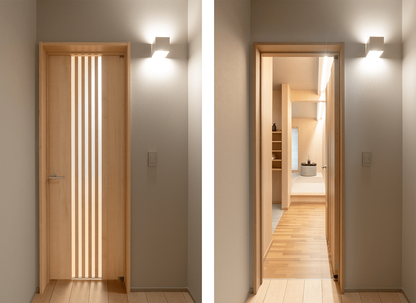 橋本: ドアはVERITIS(ベリティス)の採光タイプを採用しました。寝室のようなプライベート空間には、クロスと同調するフラットなドアを選ぶことが多いのですが、中の明かりをほんのり廊下側にも届けたいと思い、あえてこのデザインに。ベッドルームが奥まっているので、外から見える心配もありません。
