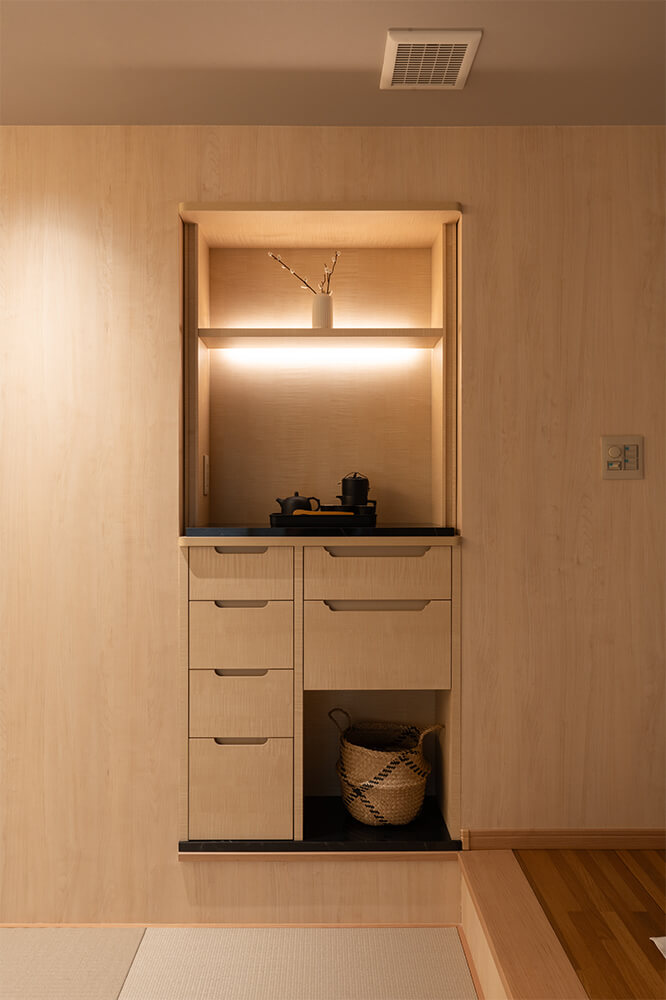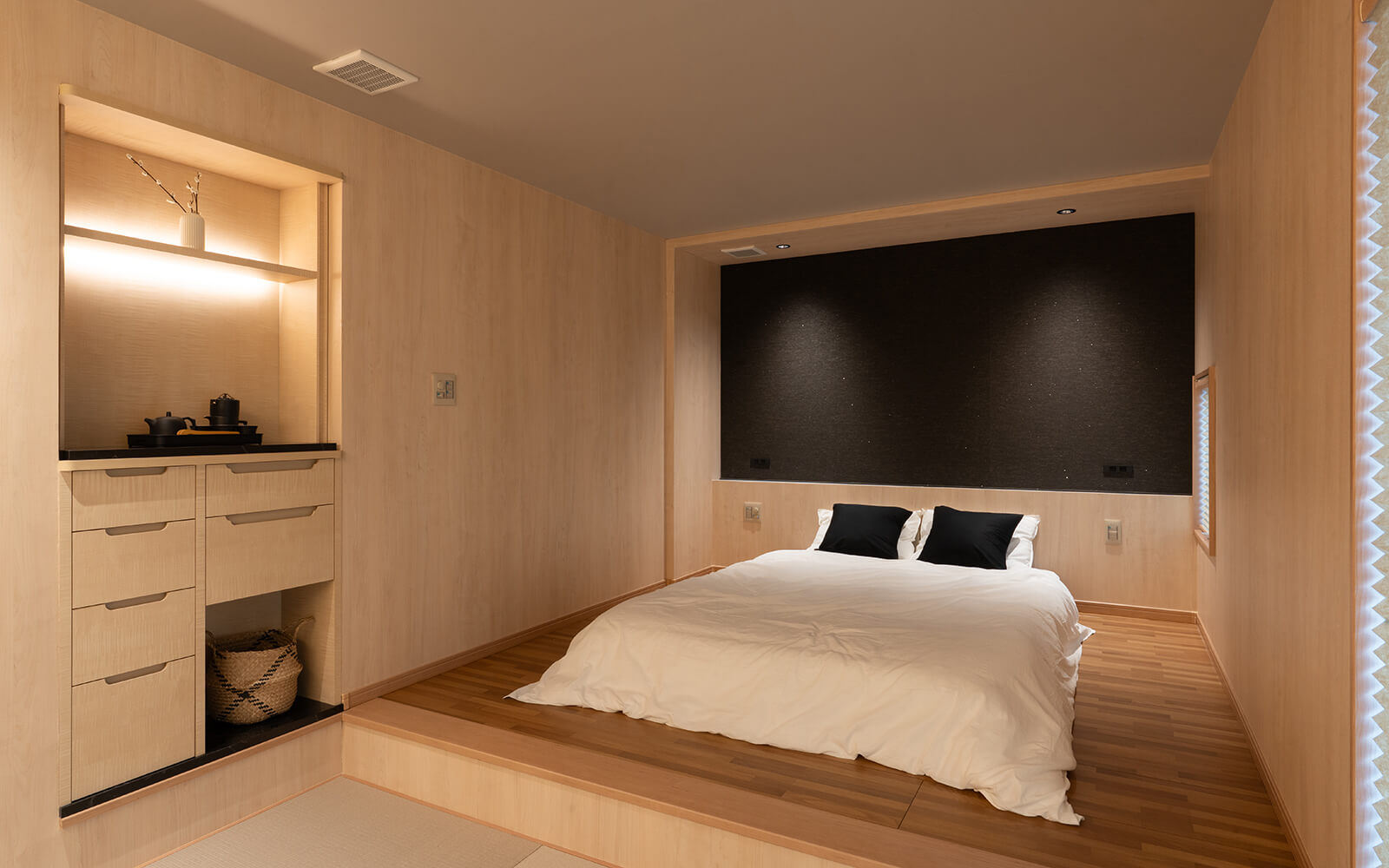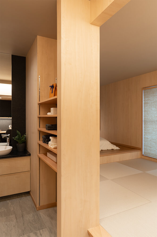 旅の始まりを思わせるメープル柄のドア。その先には、背伸びせずに楽しめる非日常が広がっています。寝室の中にホテルの客室空間をつくり上げるという驚きのアイデア。ホテルライクと和モダンの美しい調和は、辰巳住研らしさを彩る新たな1ページとなるでしょう。