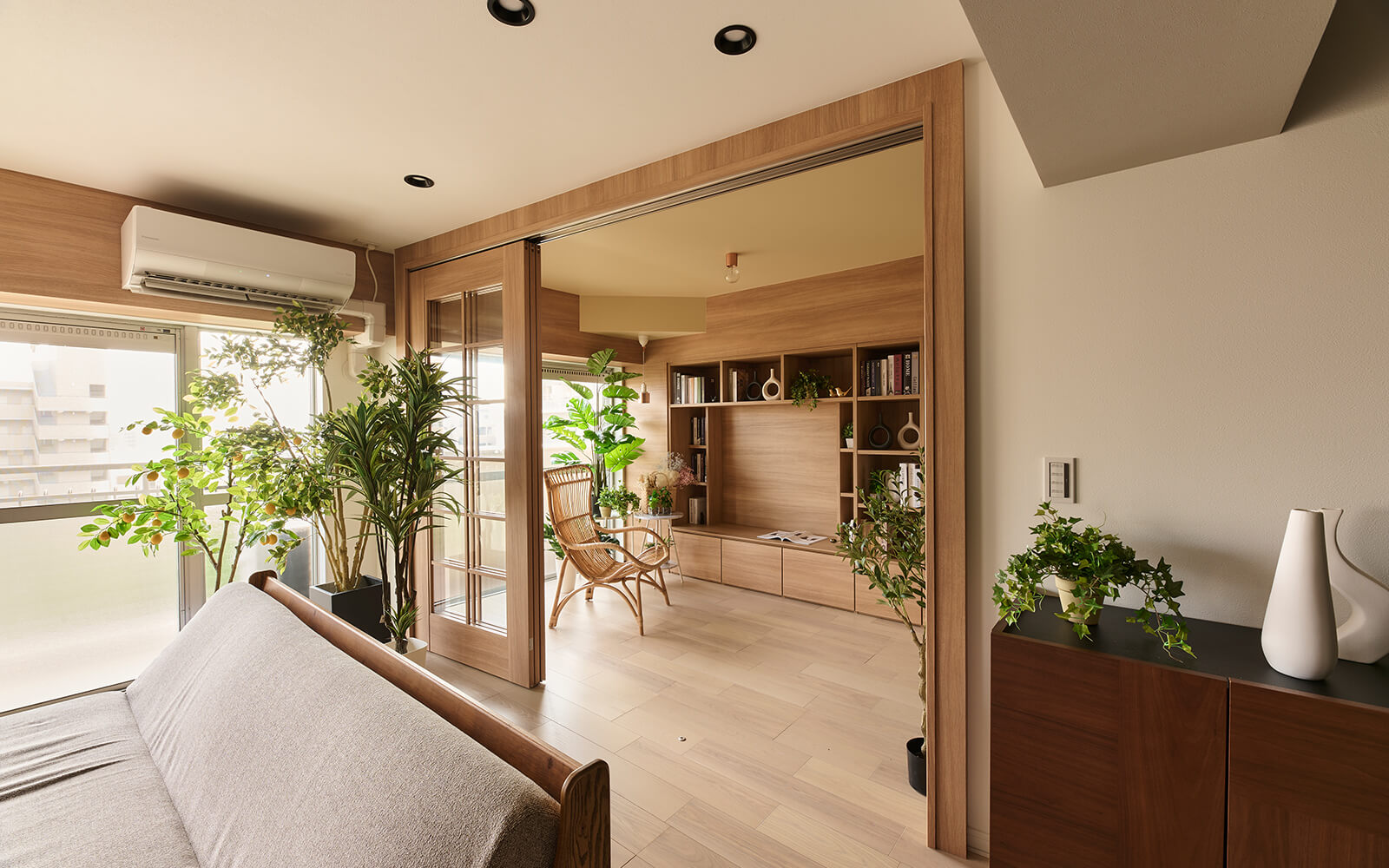 半個室をつくるときに課題になるのが冷暖房。小さな個室は熱がこもりやすく、冷暖房完備のハードルが高い。完全な個室にしなくても、リビングの一角にキュビオスやしきり窓を使って空間をゆるやかにしきるのもおすすめです。