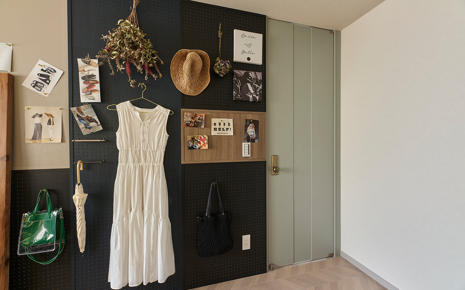 有孔ボードとマグネットボードを組み合わせた壁「偏ったトレンドは生まれず、自分らしさを自分で探す時代になった」とタブチさん。情報の波間で、どうやって自分らしさを見つけたらいいのだろう?