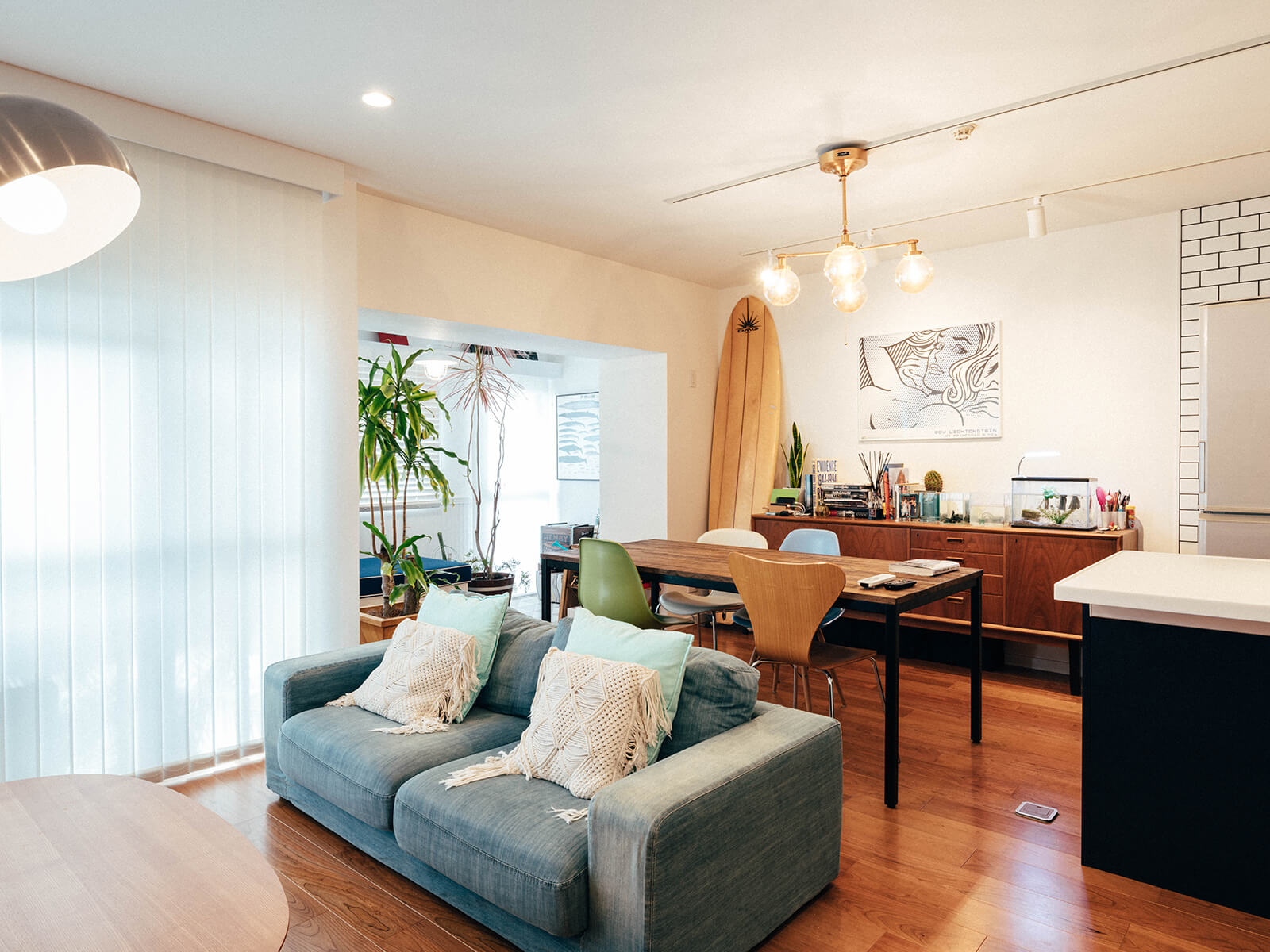築33年のマンションをリノベーションした物件のデザインコンセプトは、西海岸を想起させつつ、北欧の雰囲気も混ざった「カリフォルニアスタイル」。