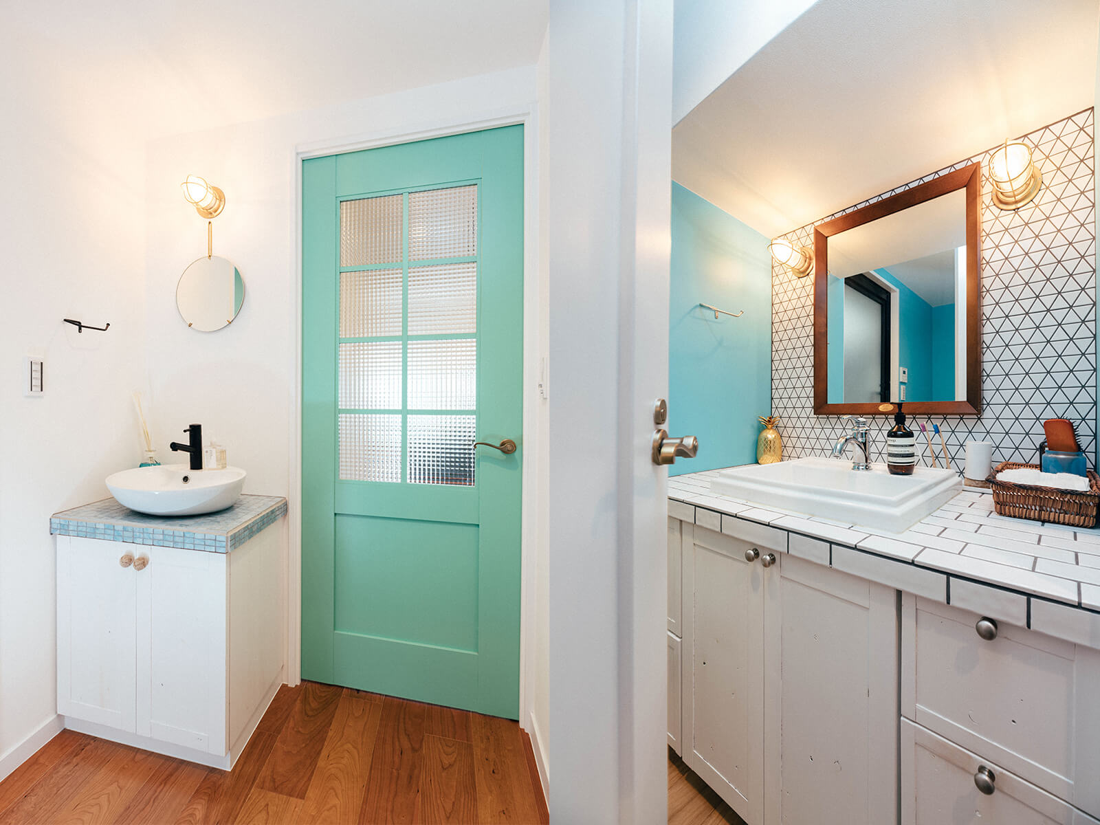 アイコンにもなるリビングのドアは、ベリティス クラフトレーベル LK型 ワイルドオーク柄(塗装対応)にターコイズブルーの塗料を塗ってアクセントに。