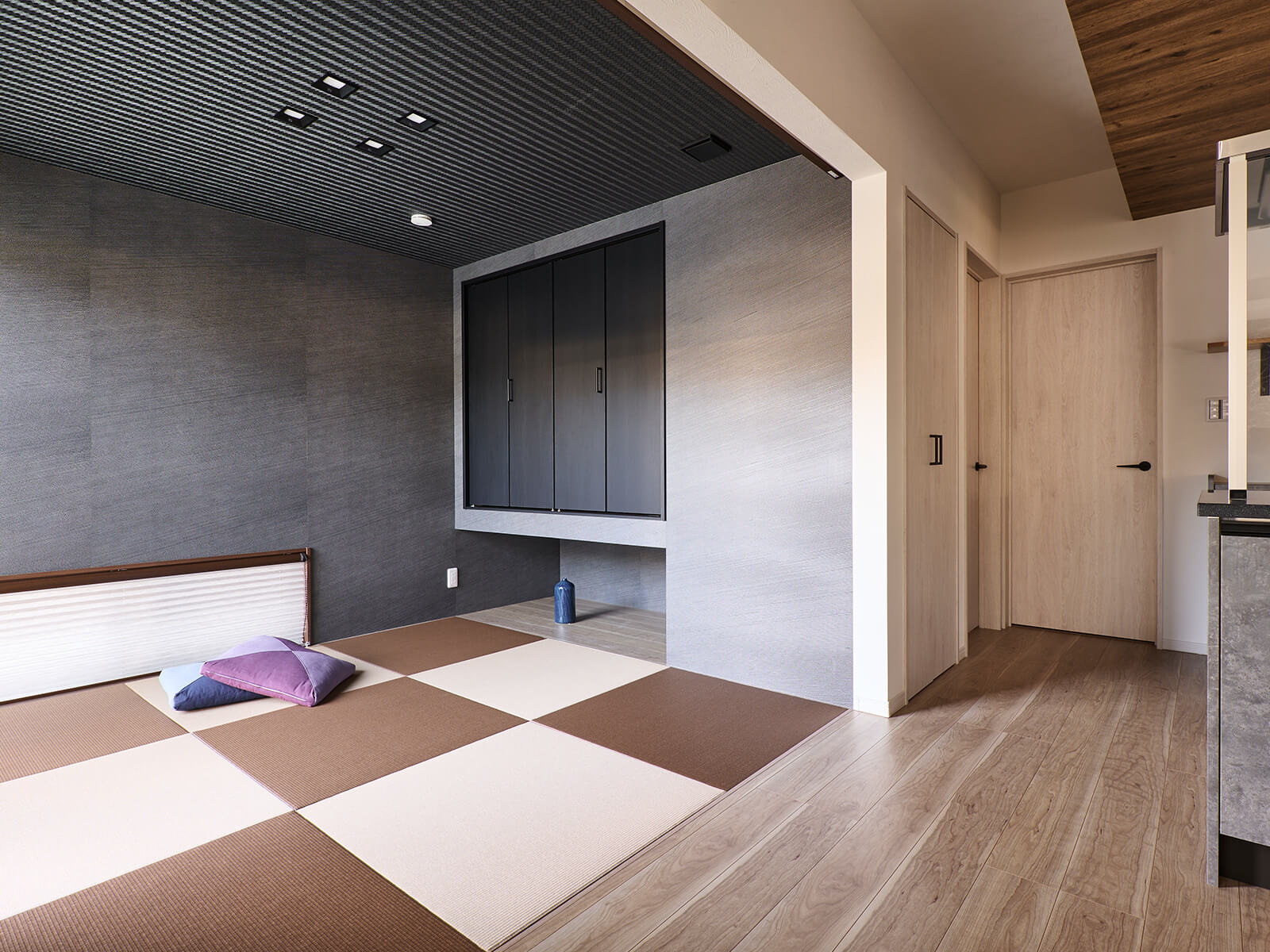 洋間と一続きにある和室は、畳の配色をベージュとブラウンに、天井を網代(あじろ)調にして、モダンに仕上げた。