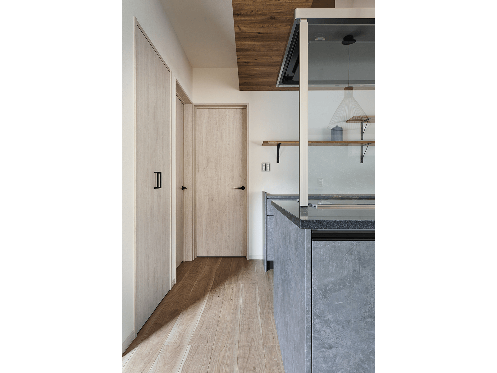 リビングにつながるドアには、適度に明るく、気配が感じられるよう、高さがあるVERITIS(ベリティス)の格子調のドアを。開放感と重厚感が共存する。