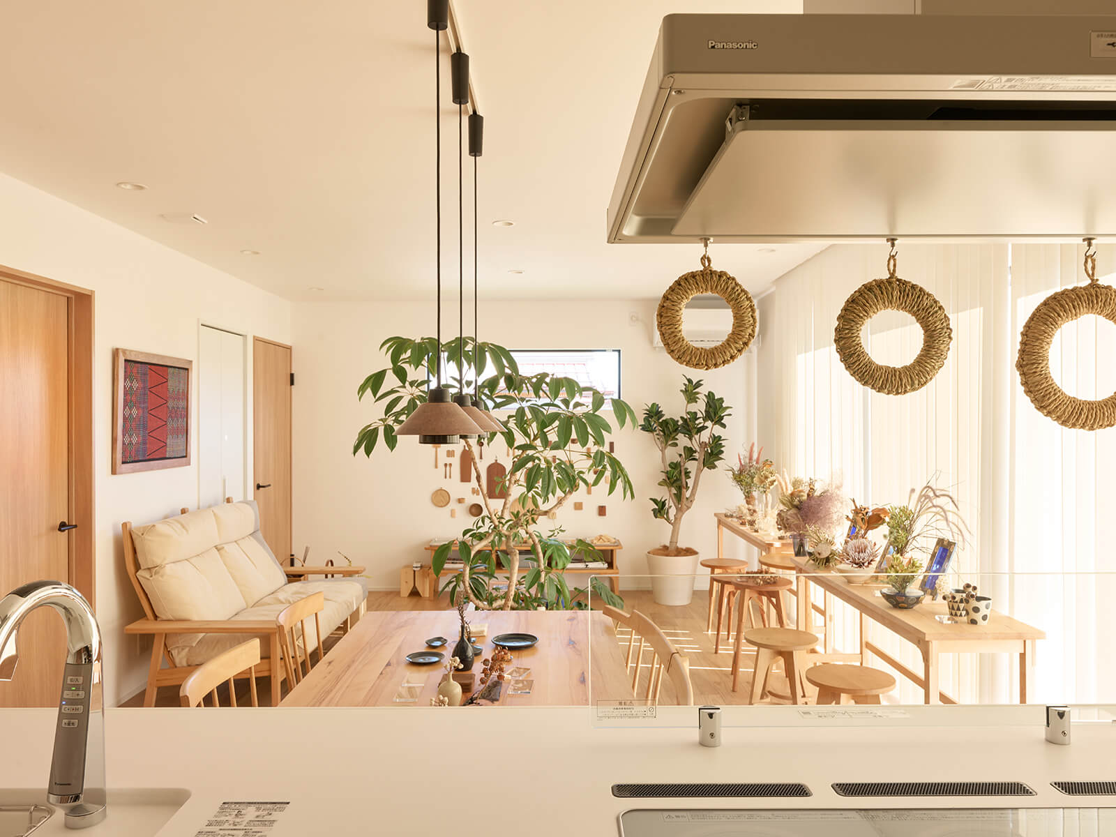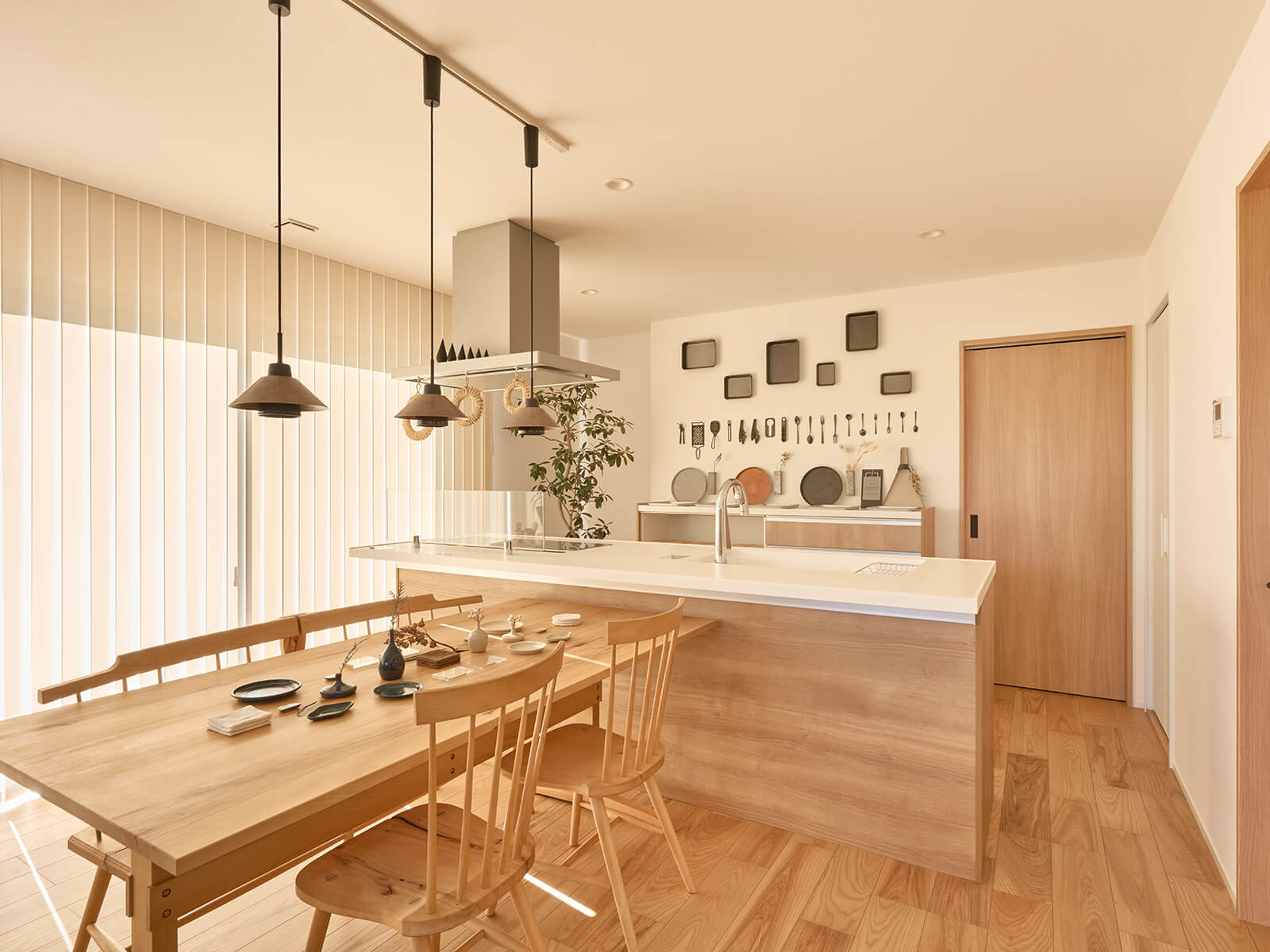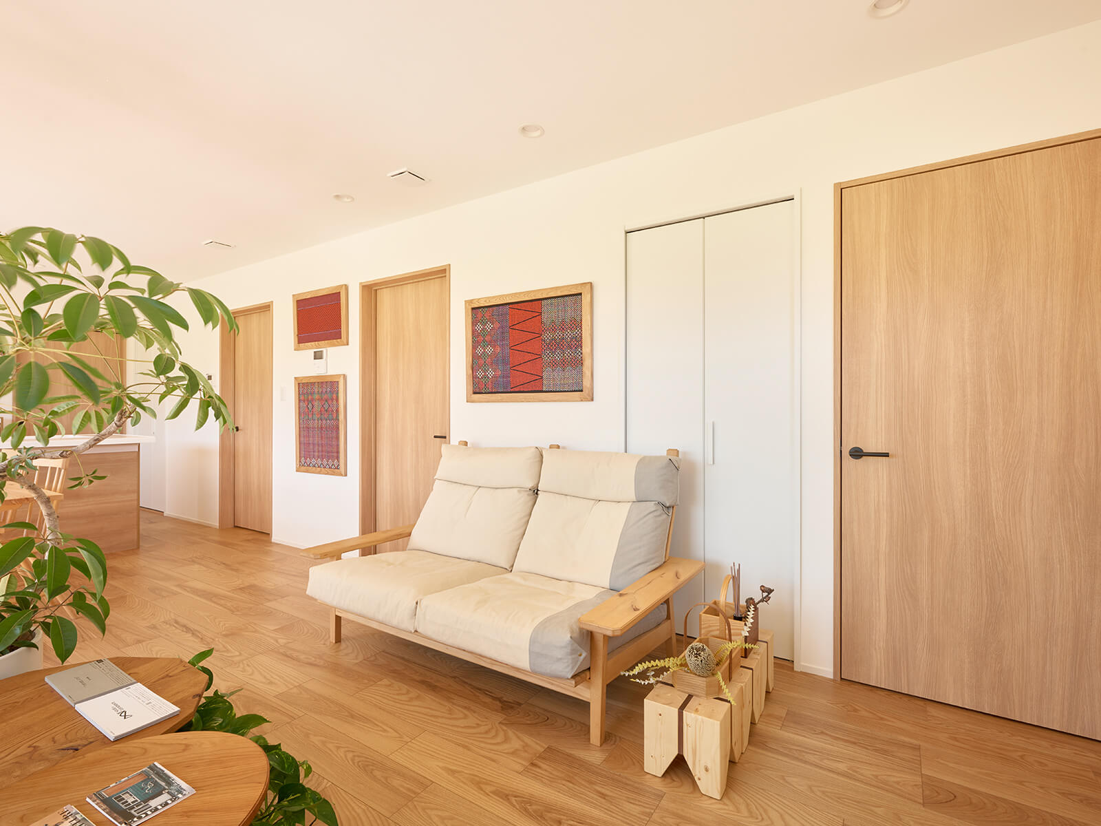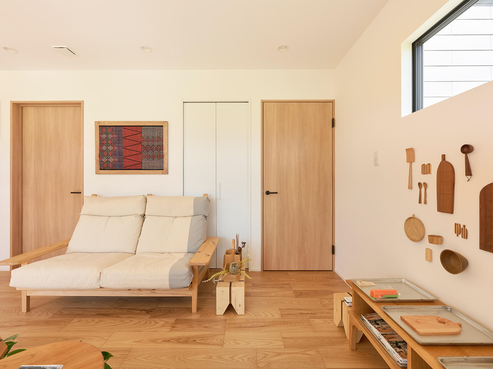デザインは、住む人それぞれの“ふつう”を受け入れられるよう、主張を抑えることを意識した。色数を抑え、床や建具はナチュラルオーク、壁と天井は漆喰調のオフホワイトで統一。