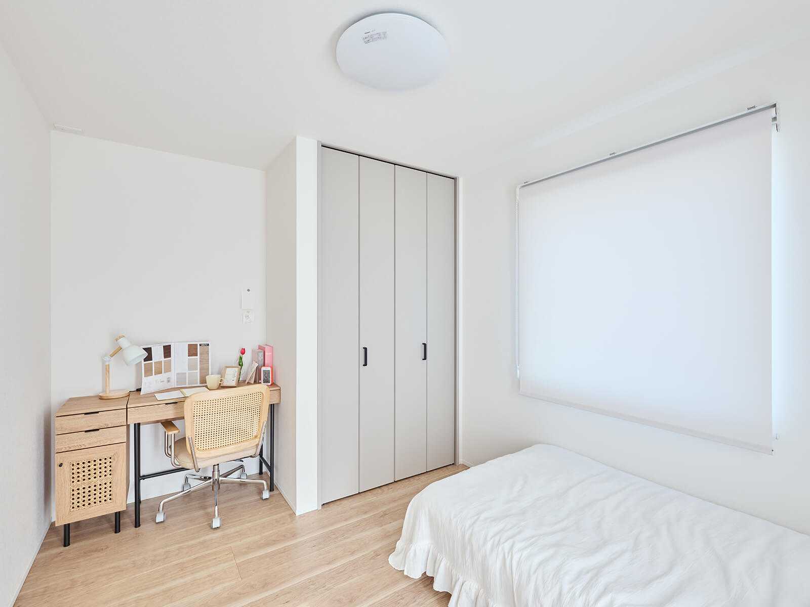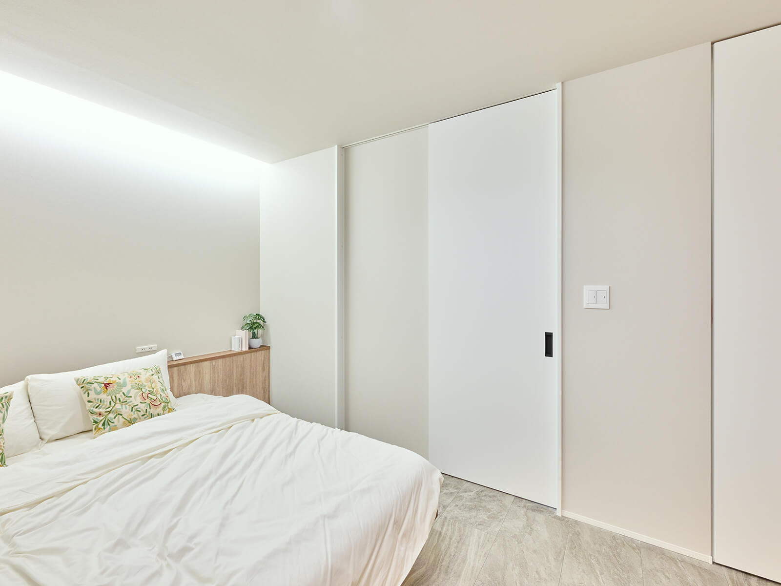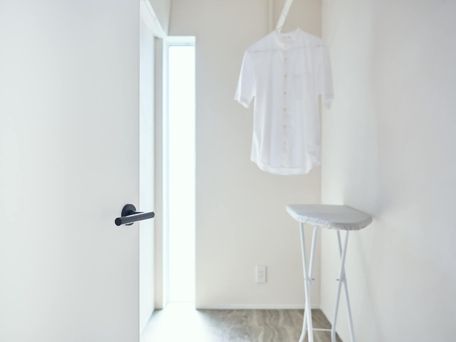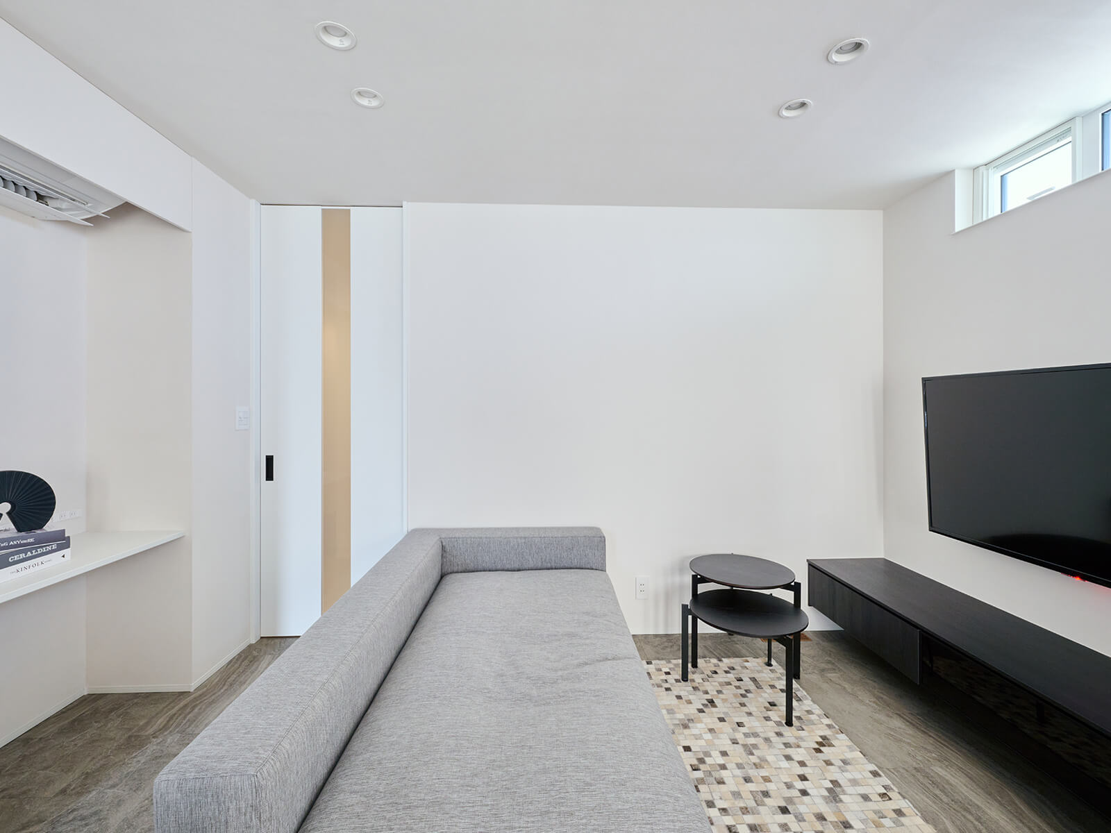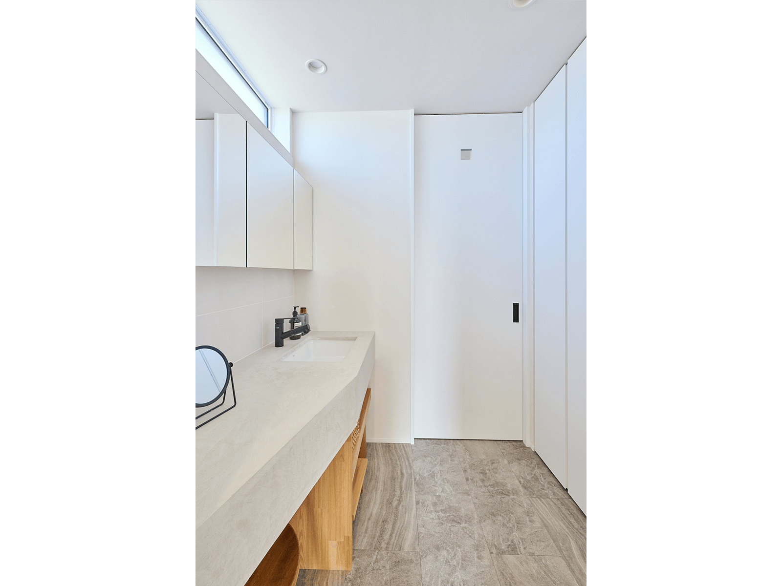 窓枠も含む建具は全てVERITIS(ベリティス)で統一。壁や天井に馴染む、しっくいホワイト柄とパールグレー柄のハイドアが、開放感と高級感を醸し出す。