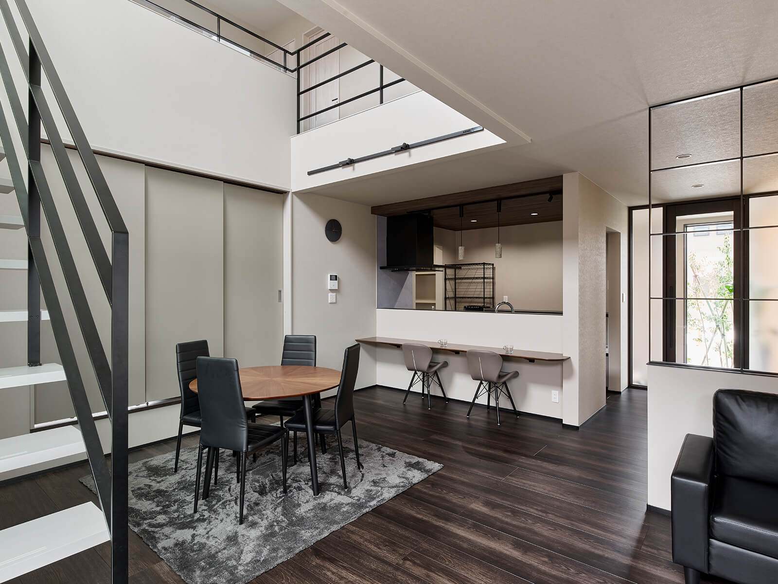 シックなホテルライクでありながら、どこか軽やかさが漂うのは、家中に明るい光が差し込むから。吹き抜けに、造作したリビングのガラス戸、各所に取り入れた「ピクチャーウインドウ」。さらに、階段や廊下、壁の一部に設えた黒のアイアンが、光を通し開放感を生む。
