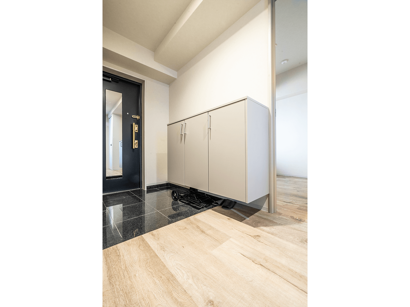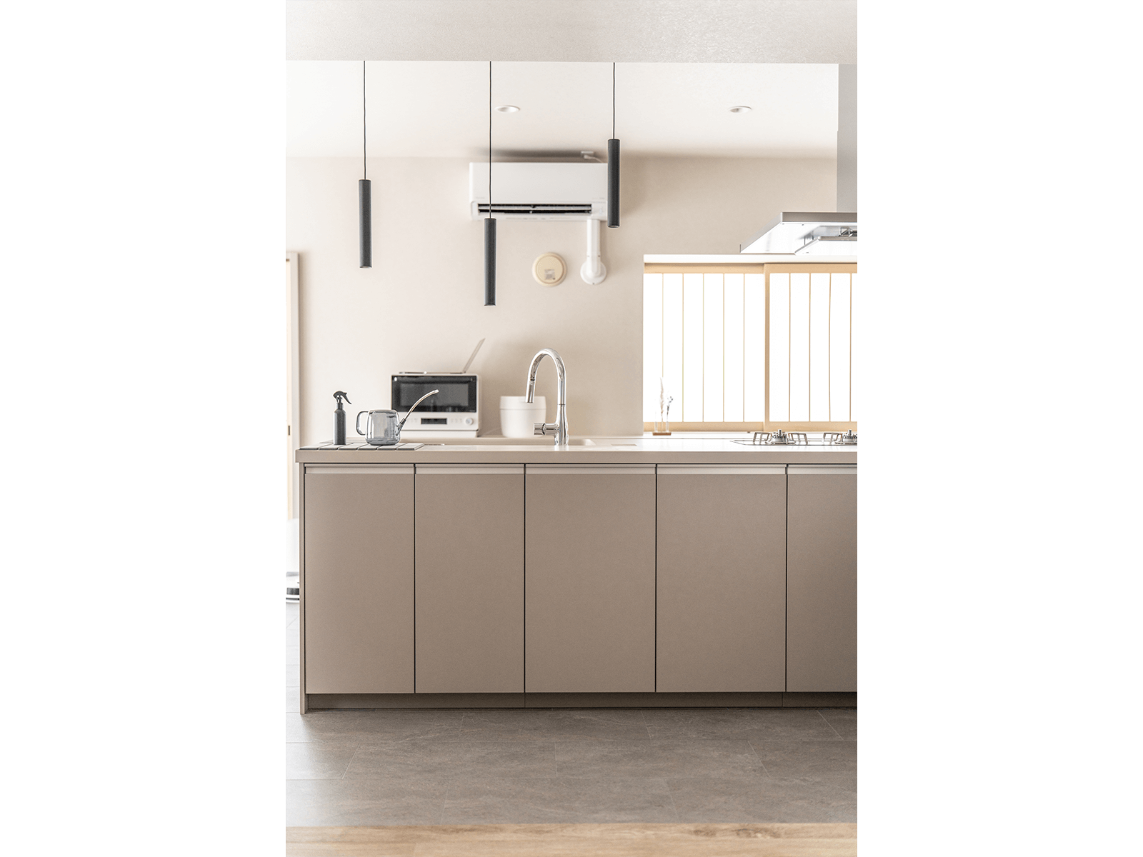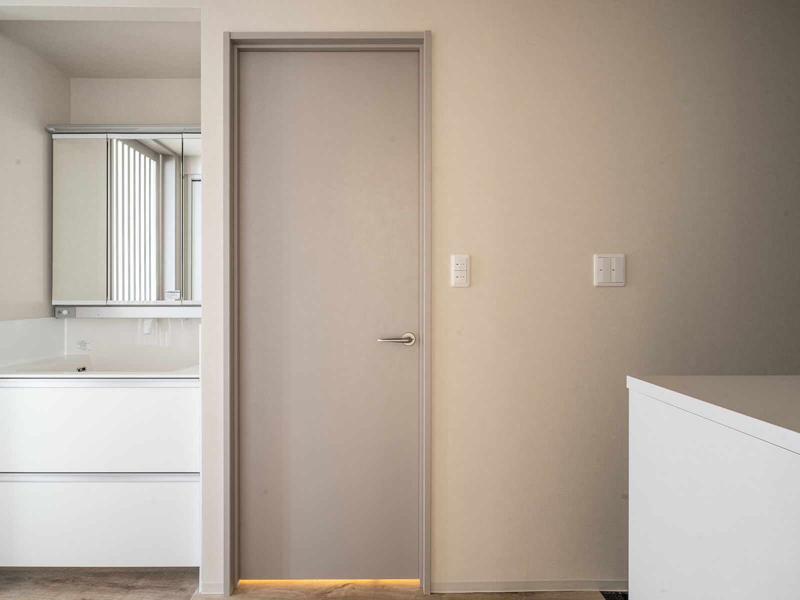 デザインはパールグレー柄を基調とした和モダンテイストに。ドアをはじめ、キッチンの扉、玄関収納用コンポリアにパールグレー柄を採用。落ち着きのあるカラーが空間全体に上品さを添える。