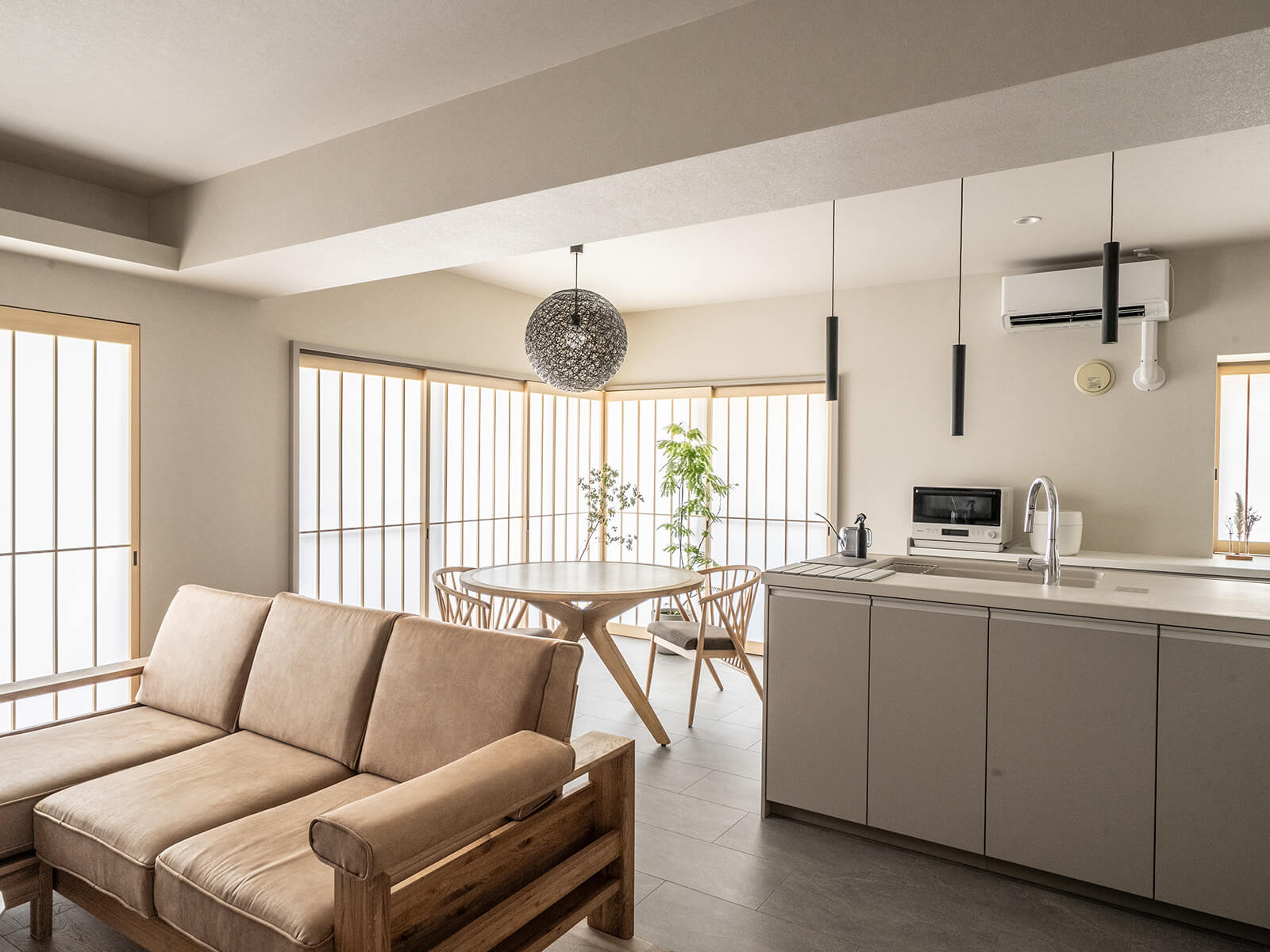 和モダンな印象の決め手となるのは、窓の手前につけた内障子。和の印象が強い障子の前にやわらかい雰囲気の円卓を置き、照明には引き締め効果のあるブラックを採用。